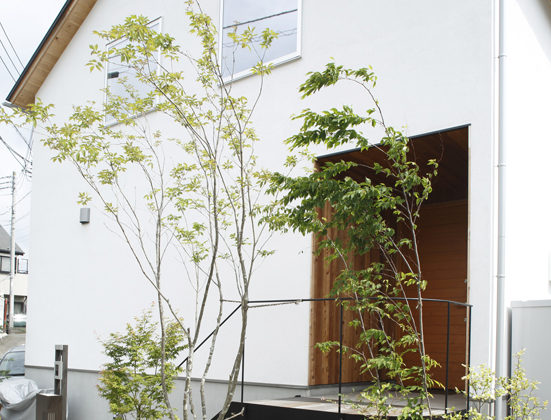 ❶鎌倉の開発地の一番奥、緑豊かな山を背景にしたT邸。レッドシダーの縦張りにモルタル外壁を併用してすっきりとしたコンビネーション。まだ若い米杉もすぐに経年変化で深みを増してくることでしょう。