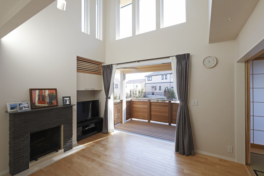 リビングからつづくウッドデッキ。吹き抜けのリビングは神奈川エコハウスの特徴的なデザイン。デッキを含め大きな空間だ。家の端から端までが見渡せるように、というのが施主のリクエスト