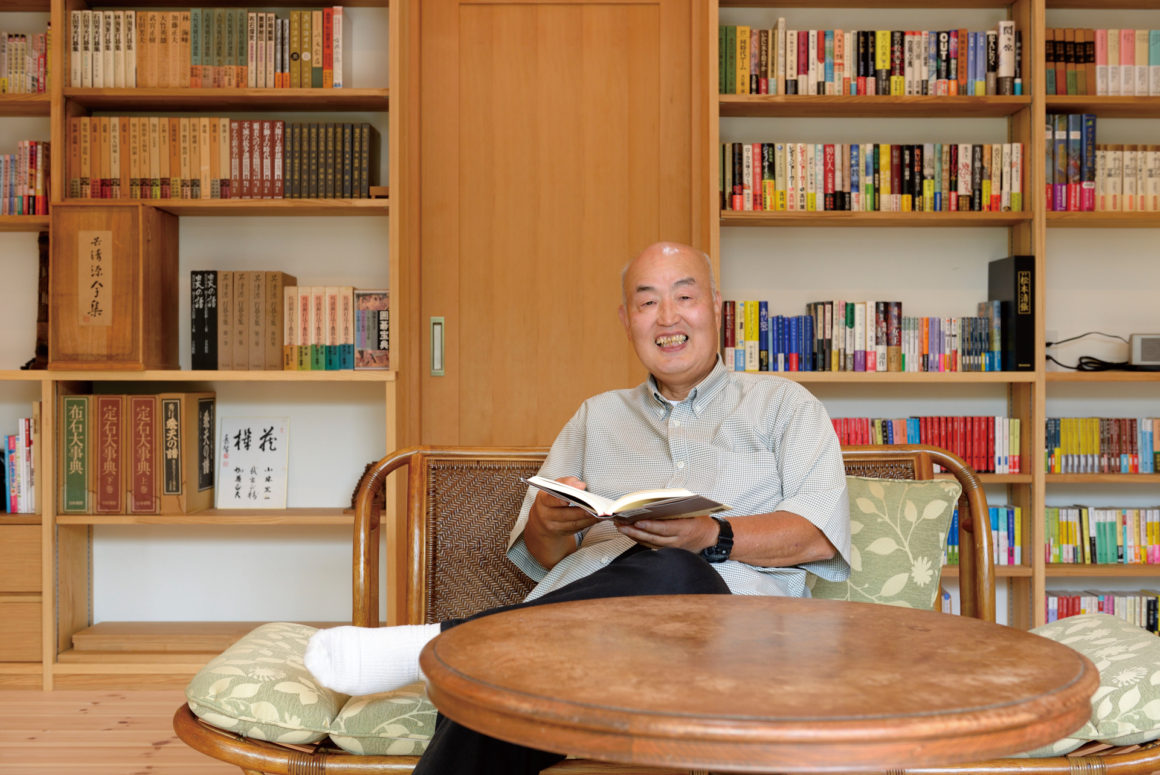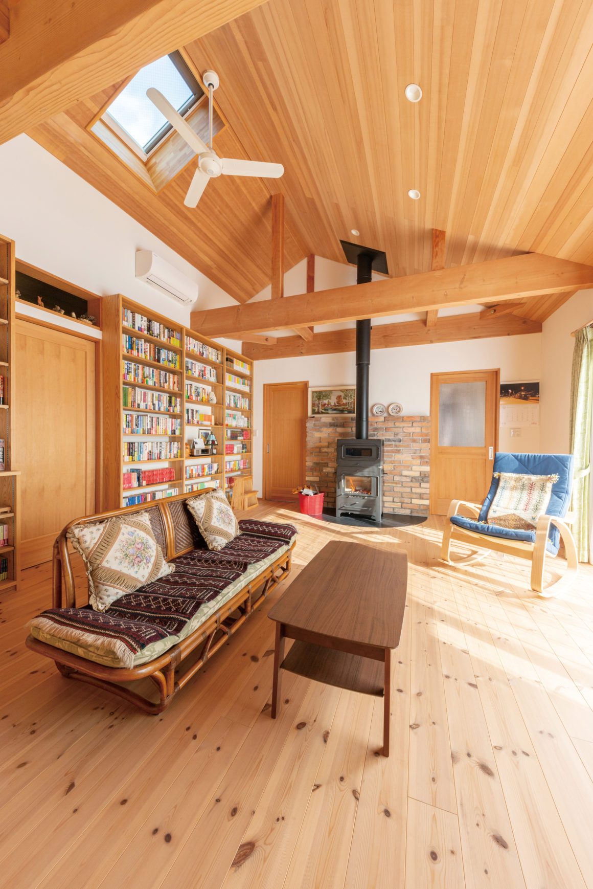 大きな梁に支えられたリビングには壁一面の書棚と薪ストーブを備えた。庭の緑を眺め、鳥のささやきを聞いてやすらぐ空間だ