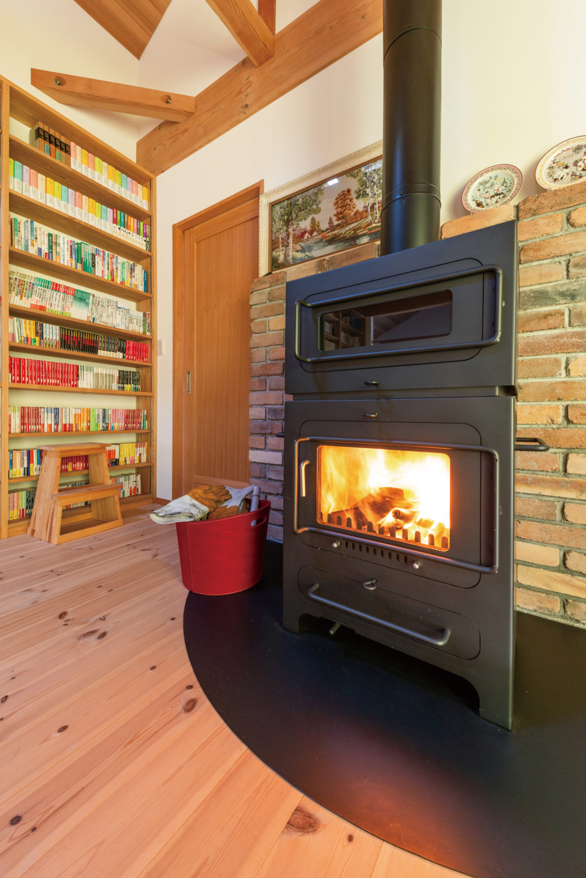 薪ストーブのあるリビングの椅子に腰掛けて読書を楽しむ。静かな空間にささやく鳥の声、吹き抜ける風。天井の高い広々としたリビング&ダイニングから丁寧に手入れされた庭をながめる。炎が揺らめく薪ストーブ。Yさんにとってほっとする時間、安らぐ空間だ。