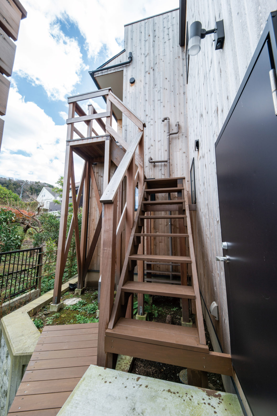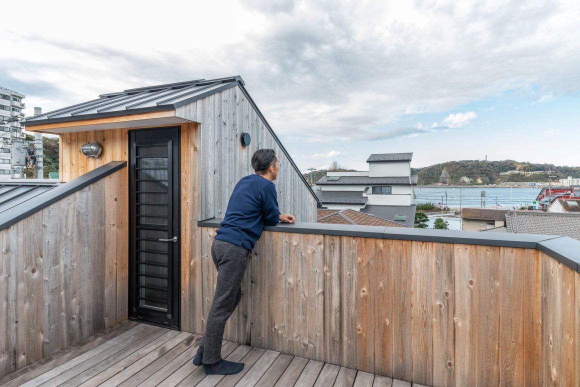 屋上バルコニーからは間近に逗子湾を望むことができる素晴らしい環境。こうして各所を拝見してみると、K様が海のそばの生活をかなり入念に研究されていた様子がうかがえます。塩害を考慮した「木」の採用、インナーガレージ、バスルームへの外階段など。