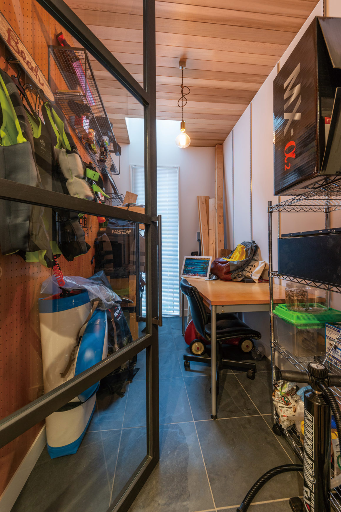 1階のガレージ横にある居室。ご主人の遊び道具がぎっしり詰まっています