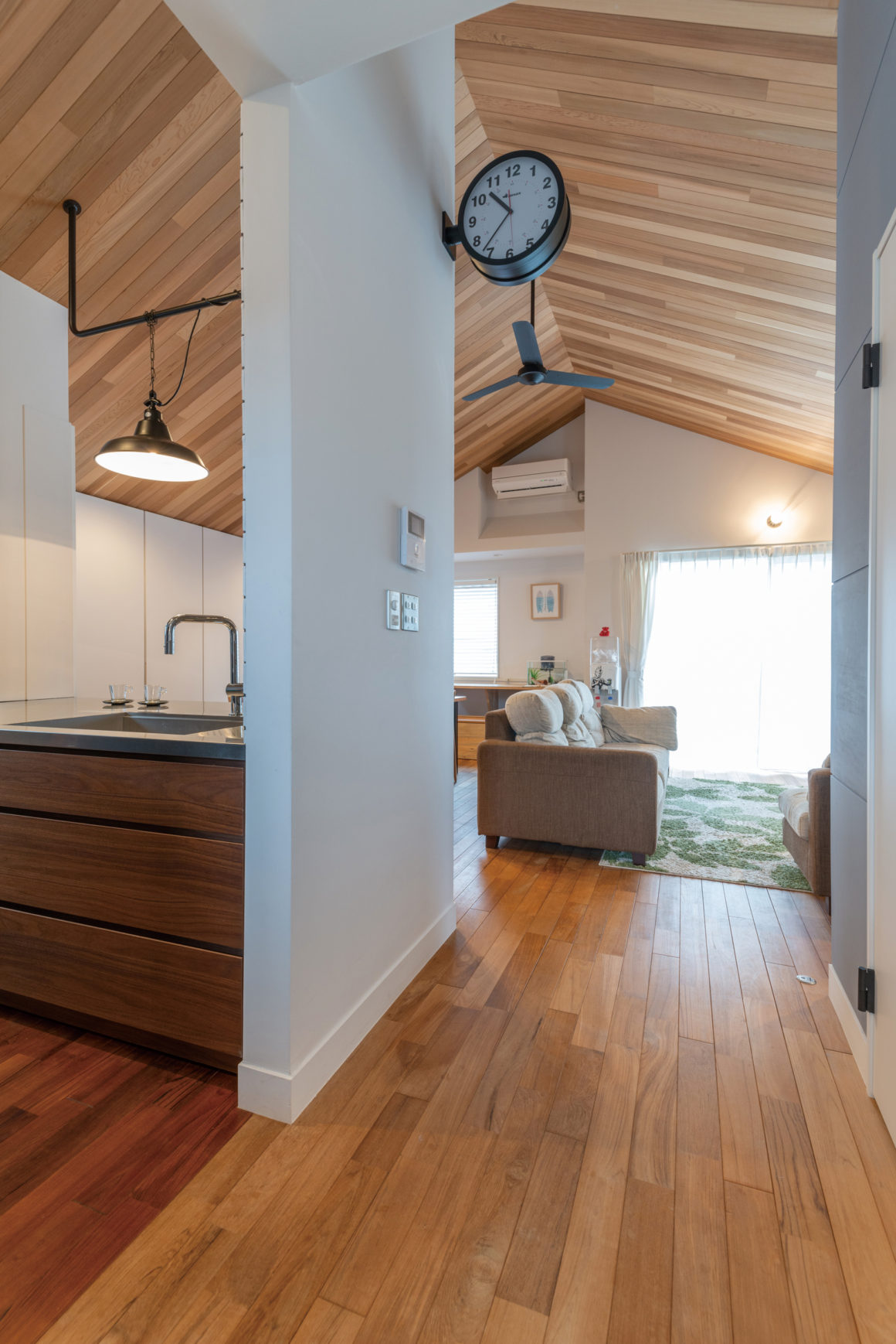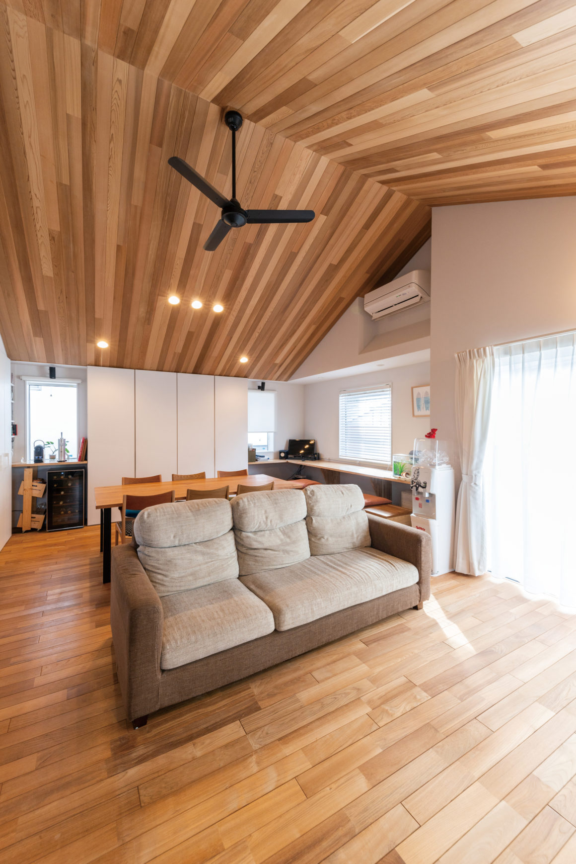 2階のリビングがご家族生活の中心で、大きな勾配天井と木の香り、そして射しこむ太陽光は、まさに湘南の海のそばの暮らしそのものです。