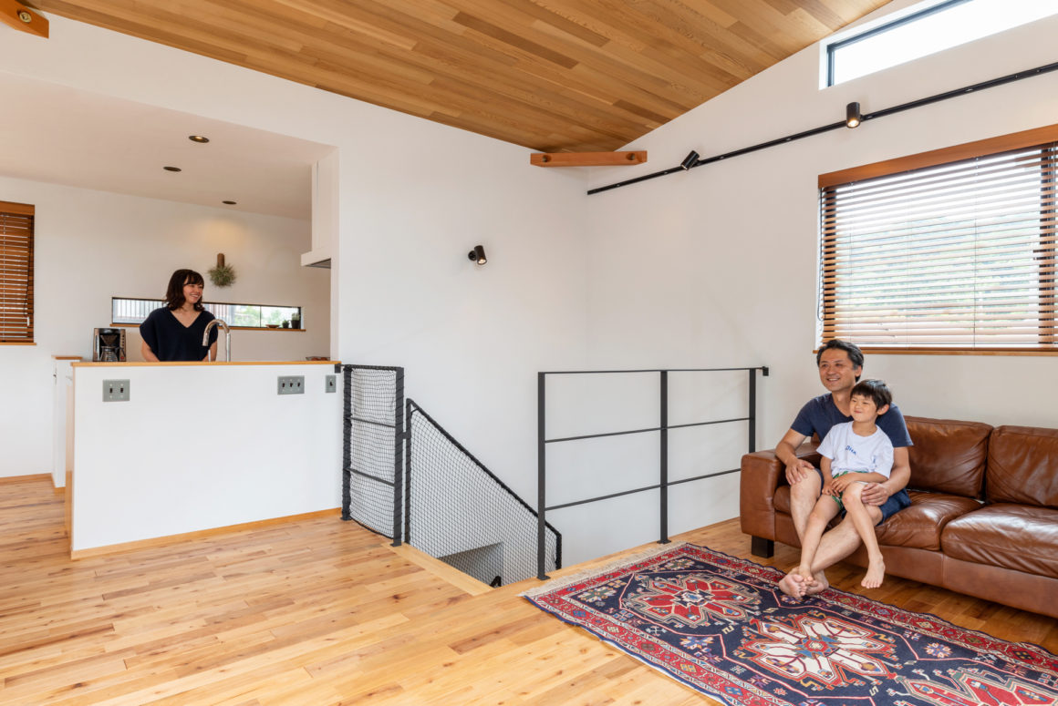 ❹リビングでくつろぐご主人とお子さま、キッチンとの距離感も近く会話も弾みます