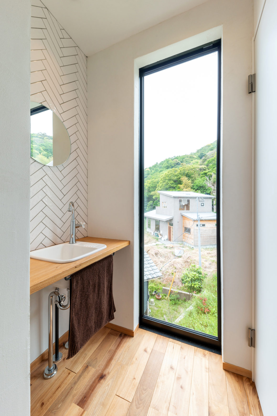 ❻2階の一角には手洗いを設置。雄大な眺望を大切にするため大きな窓を