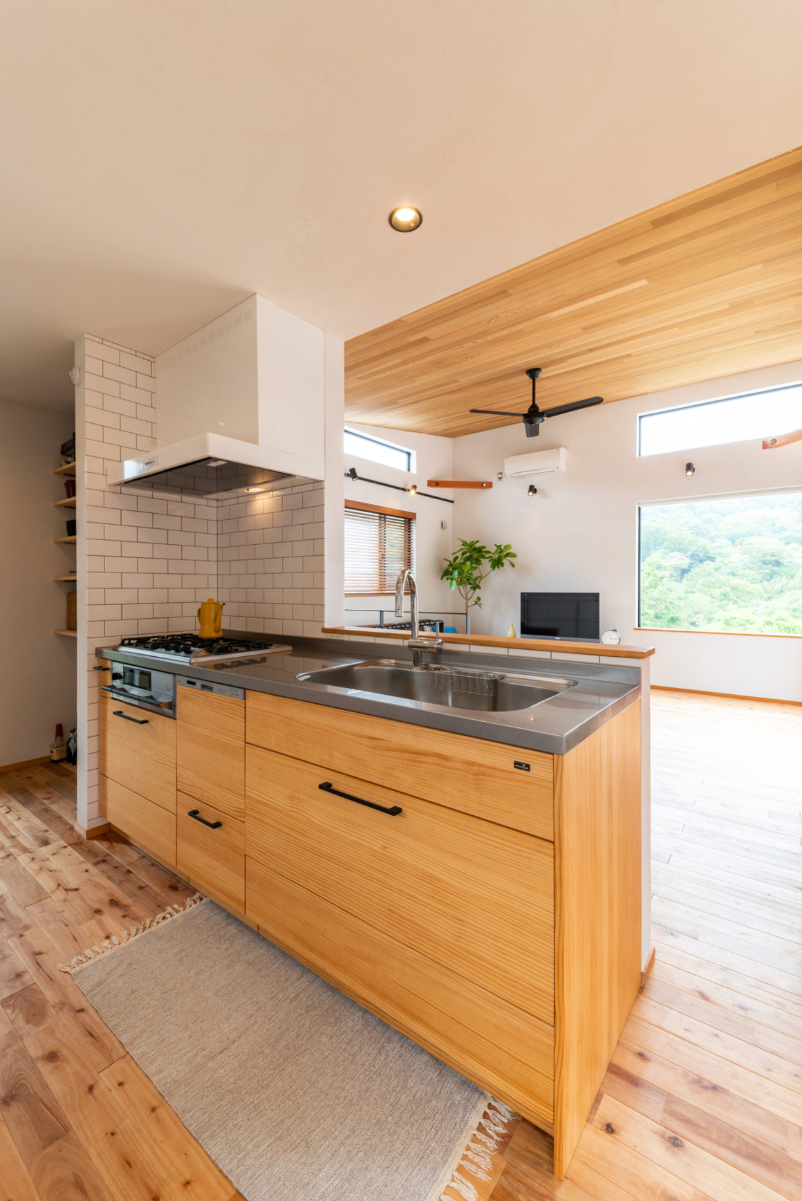❼自然素材をふんだんに使用したこともあり、キッチンにもあたたかい木目のシリーズを採用