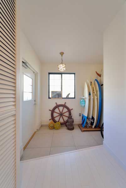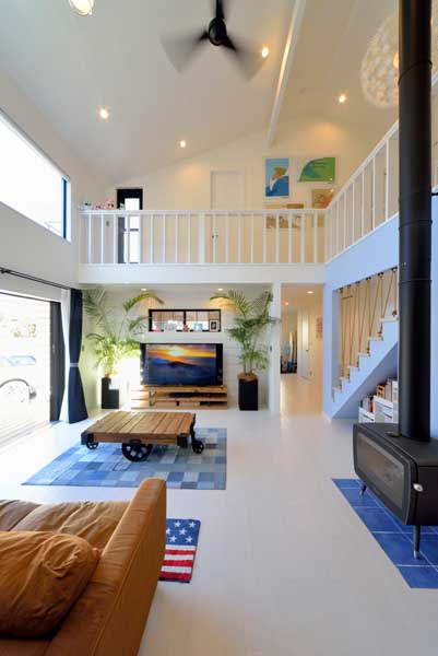 素敵なお庭ともよくマッチしたバウムスタンフならではの海辺の住まい。内部は白を基調として、風通し、光の入り方を最大限に考慮し、リビングに薪ストーブを設置して冬は吹抜を通してお家全体を暖めることで快適さを求めています。