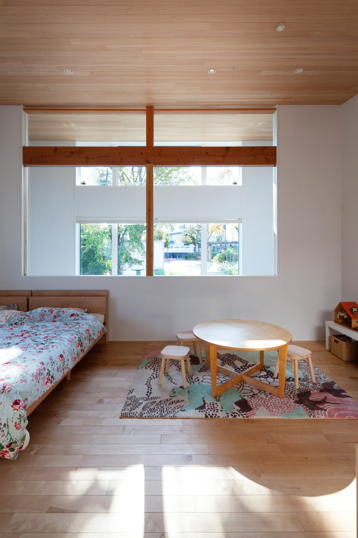 2階はそれぞれの個室とし、南側に吹抜けを設け、日射を1階のLDK奥まで取り込むように計画しました。また子供室となる2階寝室は、吹き抜けに面して室内窓を設け、窓を開けると1階LDKとつながります。