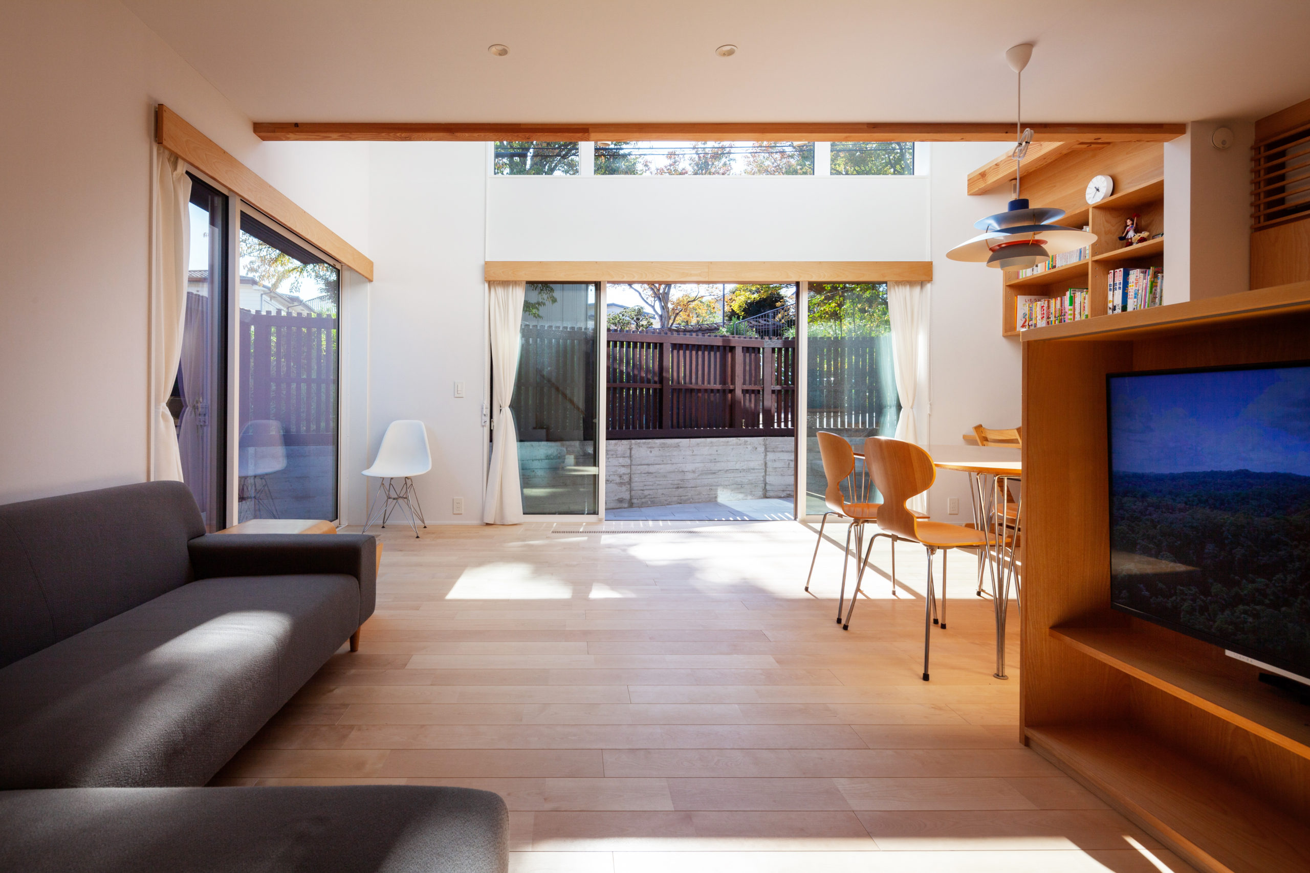 2階はそれぞれの個室とし、南側に吹抜けを設け、日射を1階のLDK奥まで取り込むように計画しました。また子供室となる2階寝室は、吹き抜けに面して室内窓を設け、窓を開けると1階LDKとつながります。