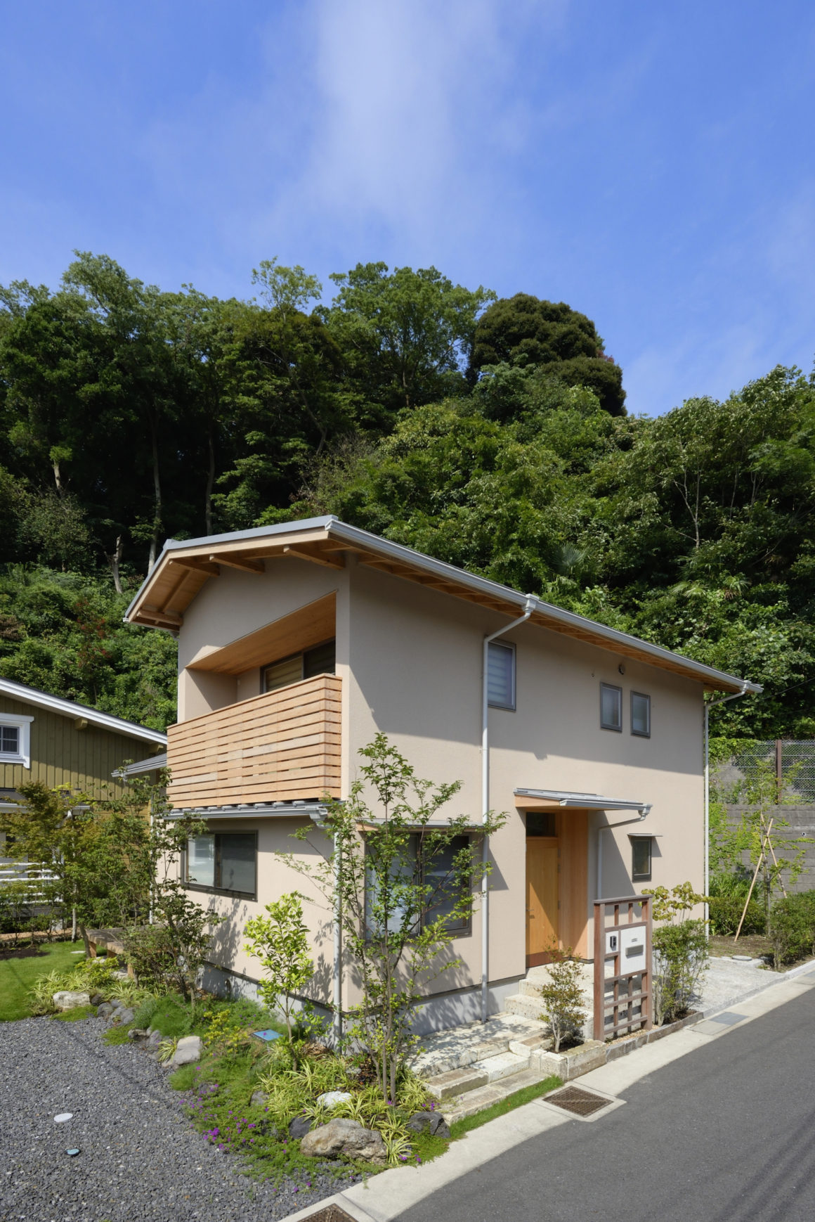 山の木々を背に、庭やアプローチの緑も鮮やかなK邸。大谷石のアプローチと木の玄関ドアが、訪れる人を温かく迎える