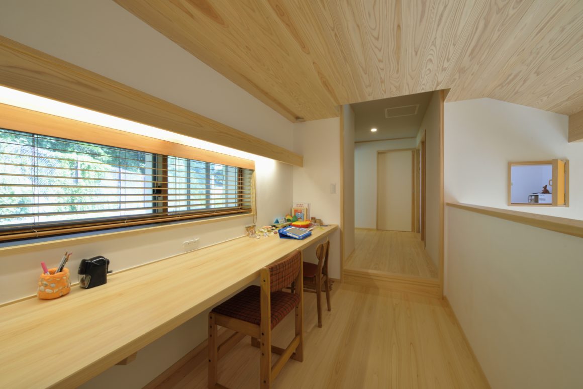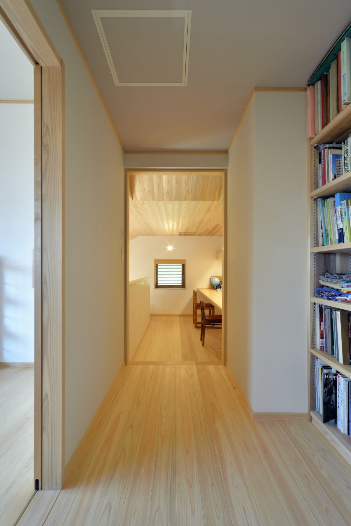 スタディコーナーを経由して子供部屋へ。本棚を造って廊下をライブラリーに