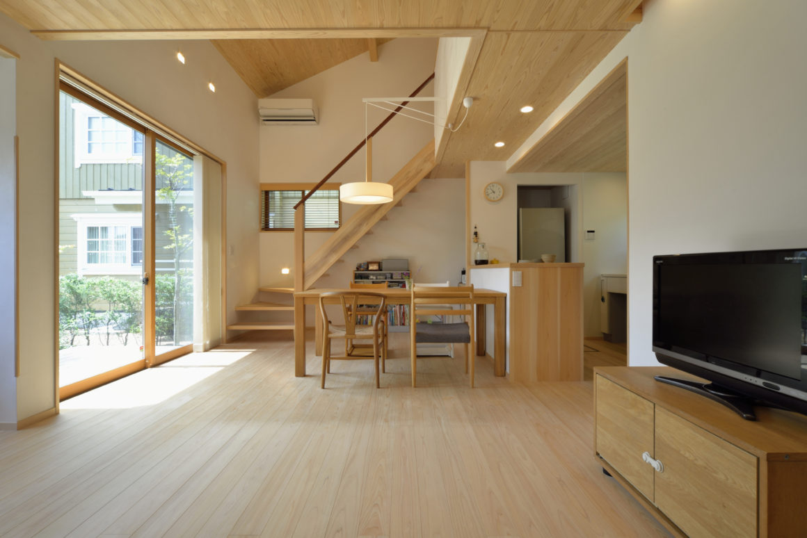 背後に山が迫っている自然豊かな恵まれた住環境で、一つひとつの区画にゆとりがあるため、道路側の開放感や、北側の山の眺望を活かす設計。生活のリアリティを押さえた何気ないデザインで、柱を隠してすっきりとさせながら、床や天井には板張りを多用して、優しく木の温かみのある住まいとなりました。