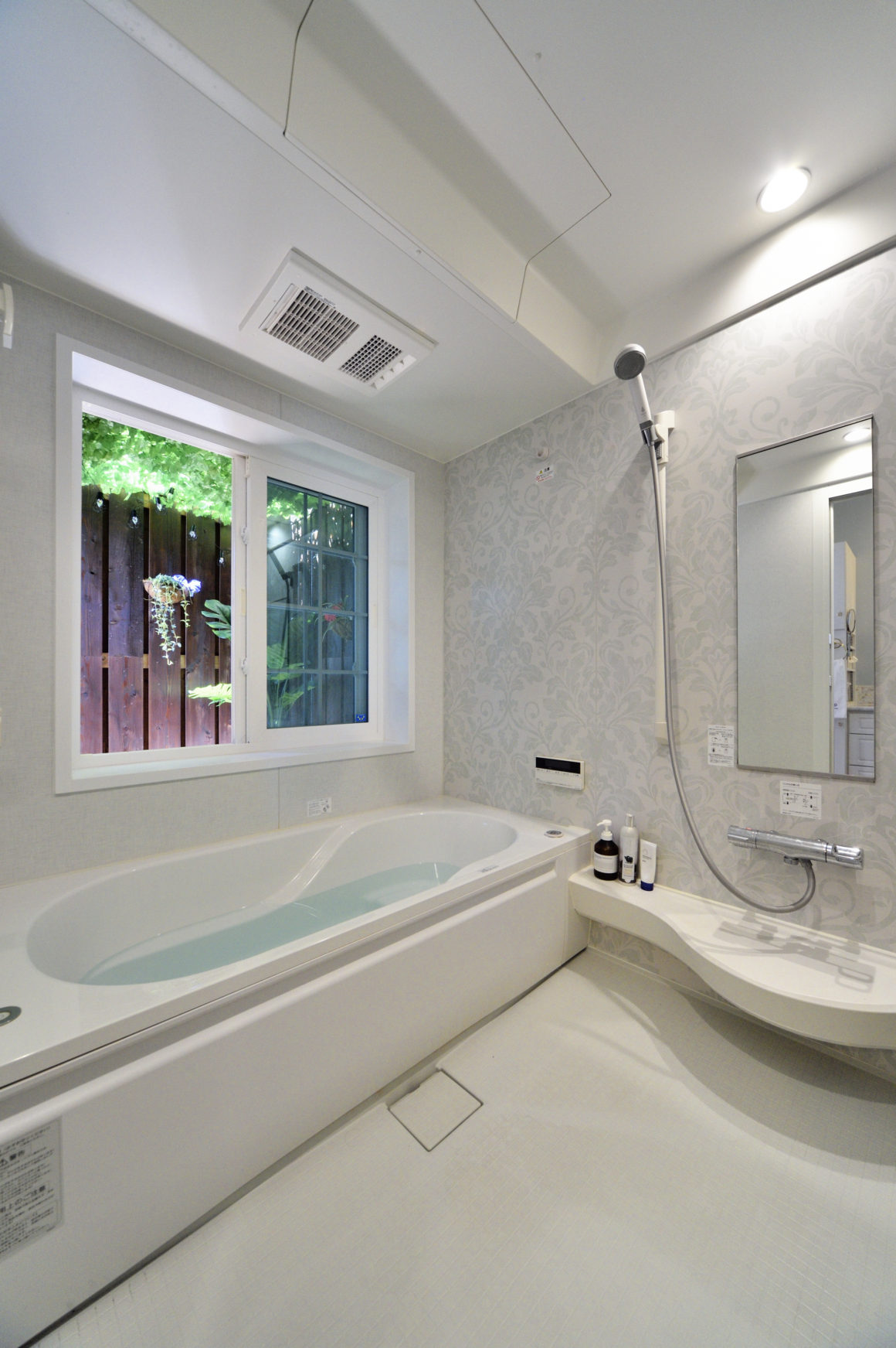 植物で目隠しを施し、夜にはライティングで入浴が楽しめるコートテラスを設置したバスルーム