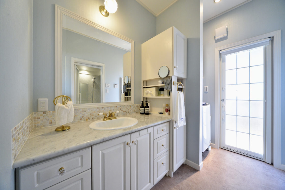 奥様がこだわって造作してもらったのは、パウダールームのコスメコーナー棚のニッチ