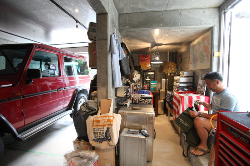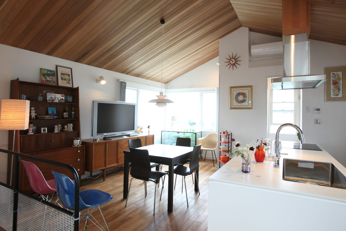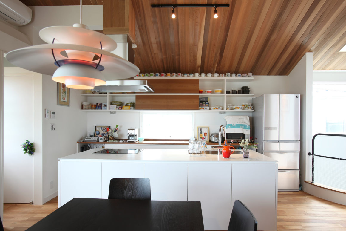 ファイヤーキング等のマグカップの収集も多くキッチンまわりの収納もフロア全体の雰囲気を保つための大切な鍵。キッチン背の棚を圧迫感のない半扉としたり、細かな配慮が見受けられる。勾配天井の米杉と白基調のキッチンとのコンビネーションが美しい