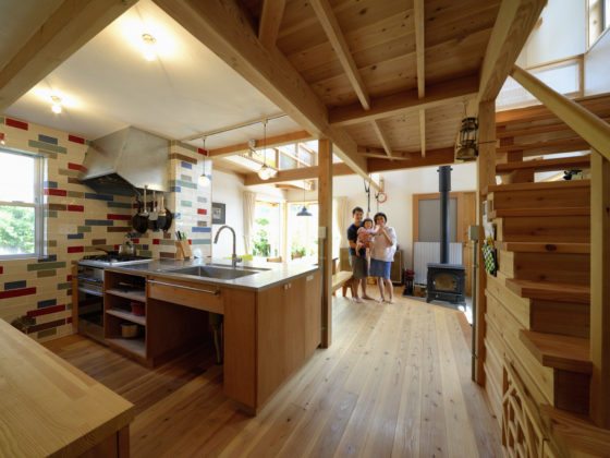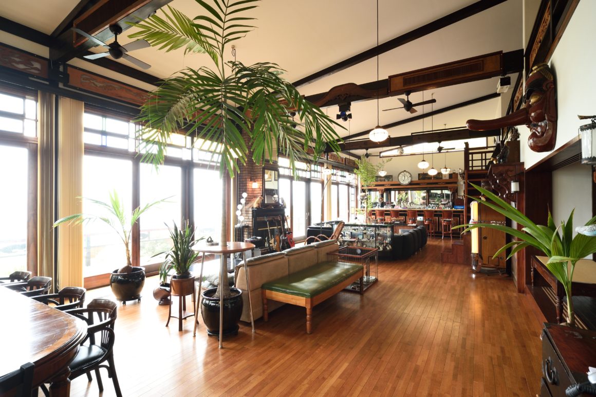 母屋の大きなリビング。カメラの位置から向こうのバーカウンターまで18.4メートル。野球のピッチャーマウンドからホームベースまでの距離だと小森さんが笑う