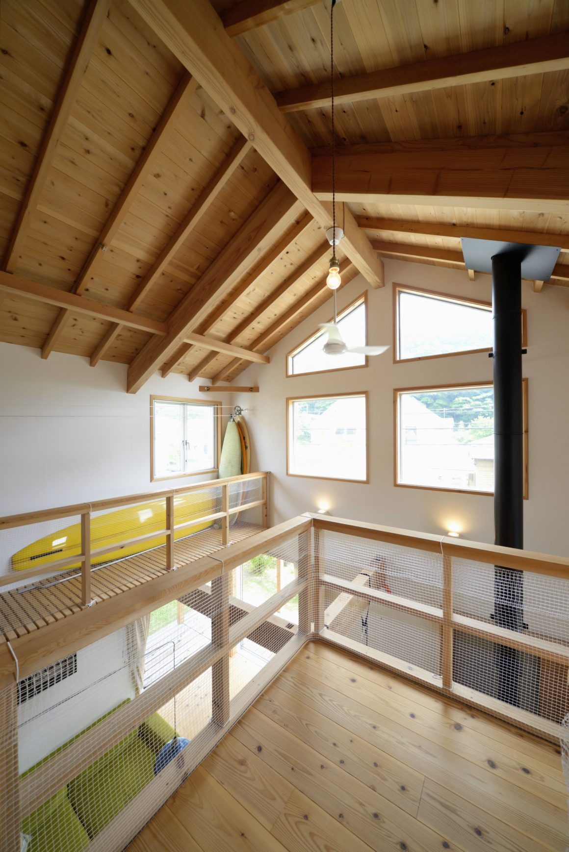 この家の空間で間仕切っているのは水回りと寝室だけ、あとは1階と2階も大きな吹き抜け空間でつながったたいへんおおらかな空間になっていて、家のどこに居ても家族の気配を感じられる家です。
