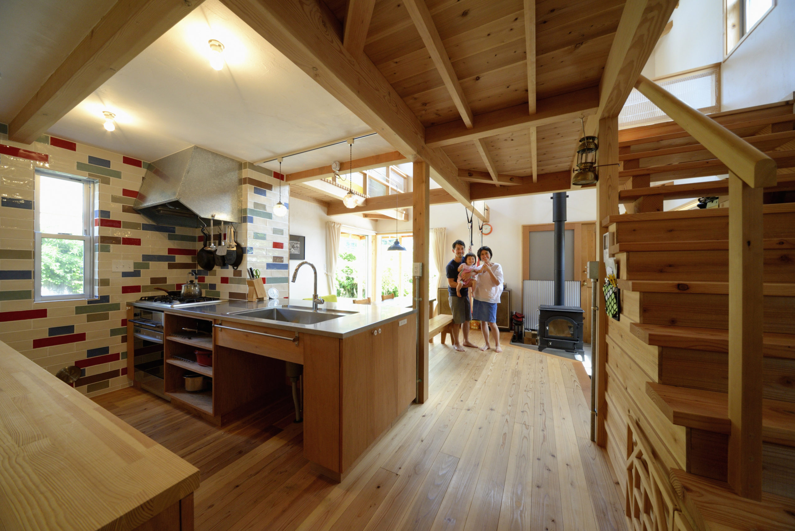 施主が家づくりに参加するセミ・セルフビルド。なかでもこのK邸は施主が壁塗りからタイル貼り、ドアなどの建具製作まで参加してしまうほどの力の入れよう。それも木の家ならではの魅力かもしれないですね。