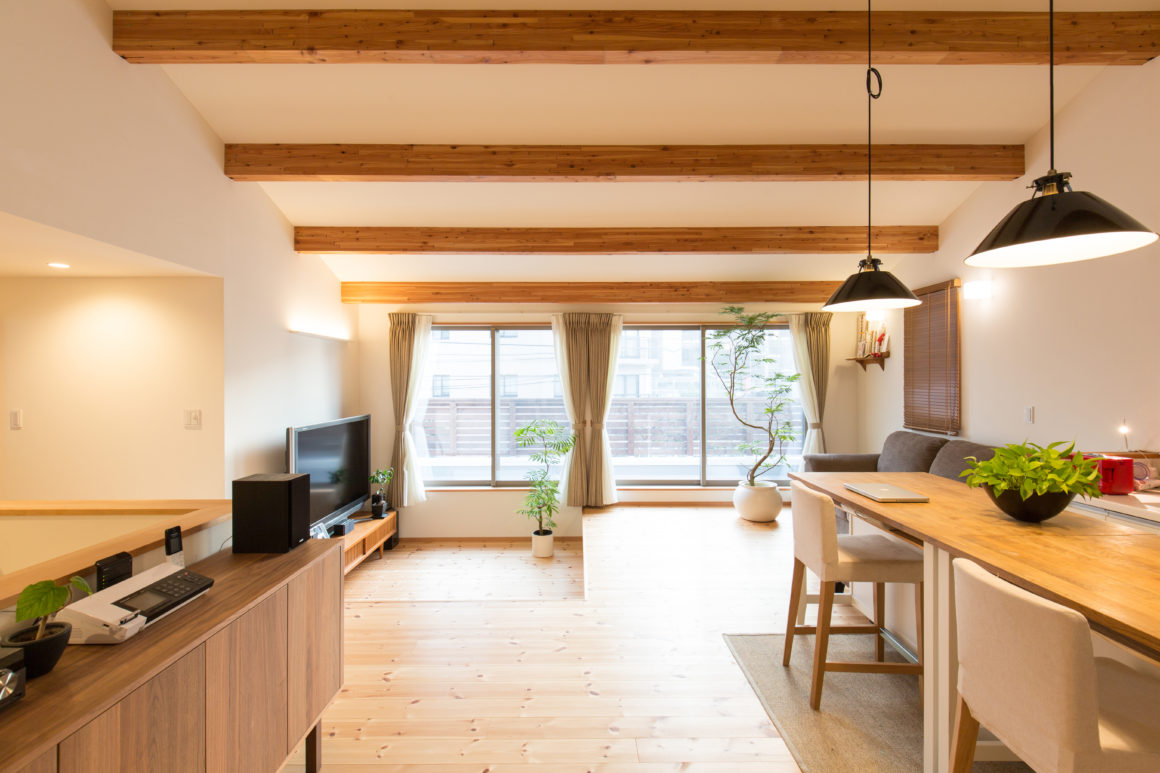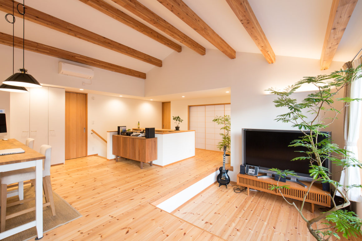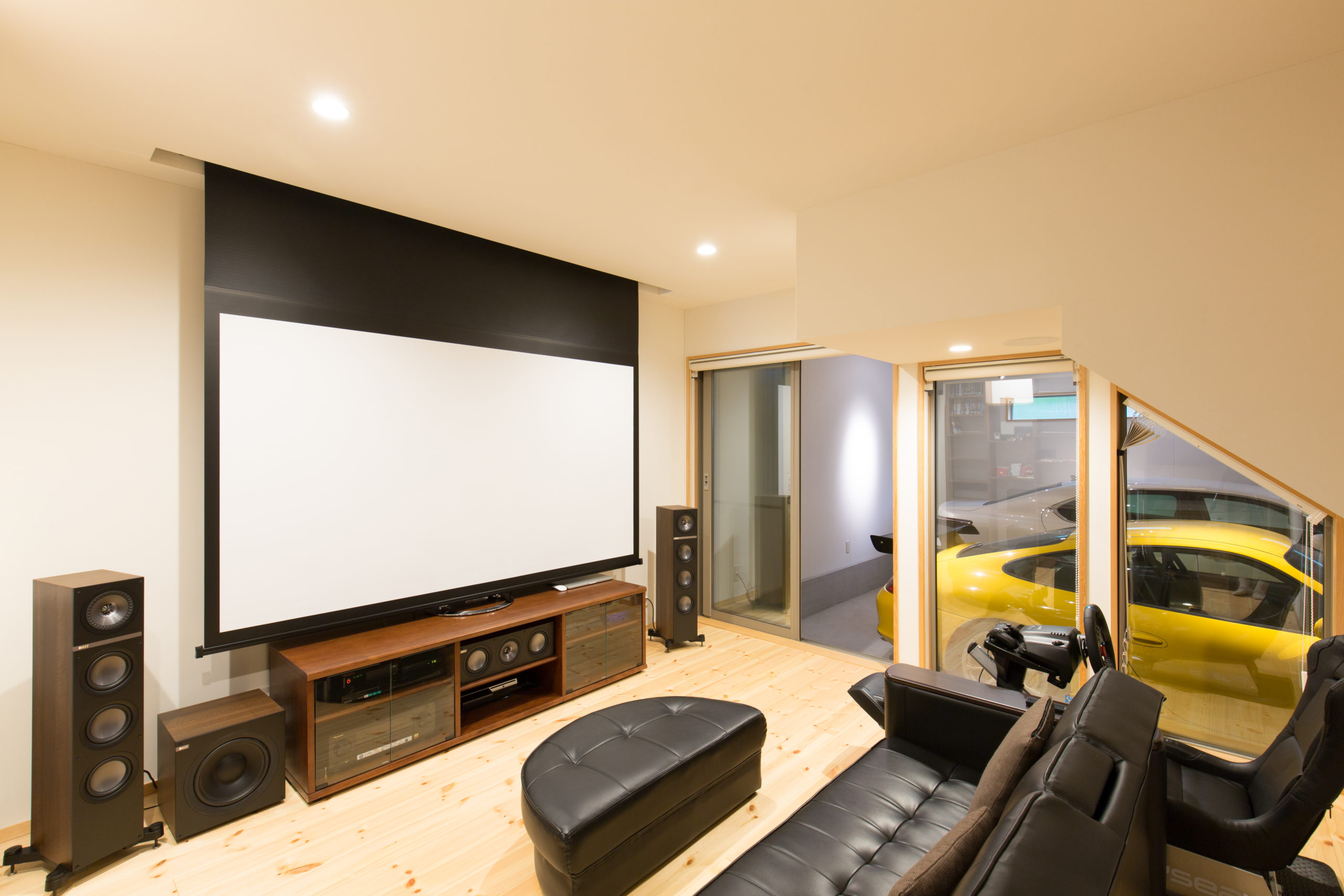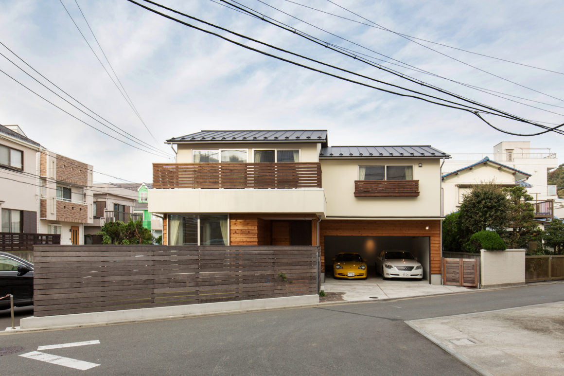 海のすぐそばに建つK邸は塩害に強い「木」の家を選ばれました。車が余裕で2台入るガレージや2階の大空間やテレビコーナーの彫り込みは、ズバリ構造上強度の高いSE構法のメリット。幅5mもある木製シャッターも既製品では珍しく、天井には埋め込みの音響スピーカーを設置。強い構造体と生活のしやすさを兼ね備えた邸宅です。