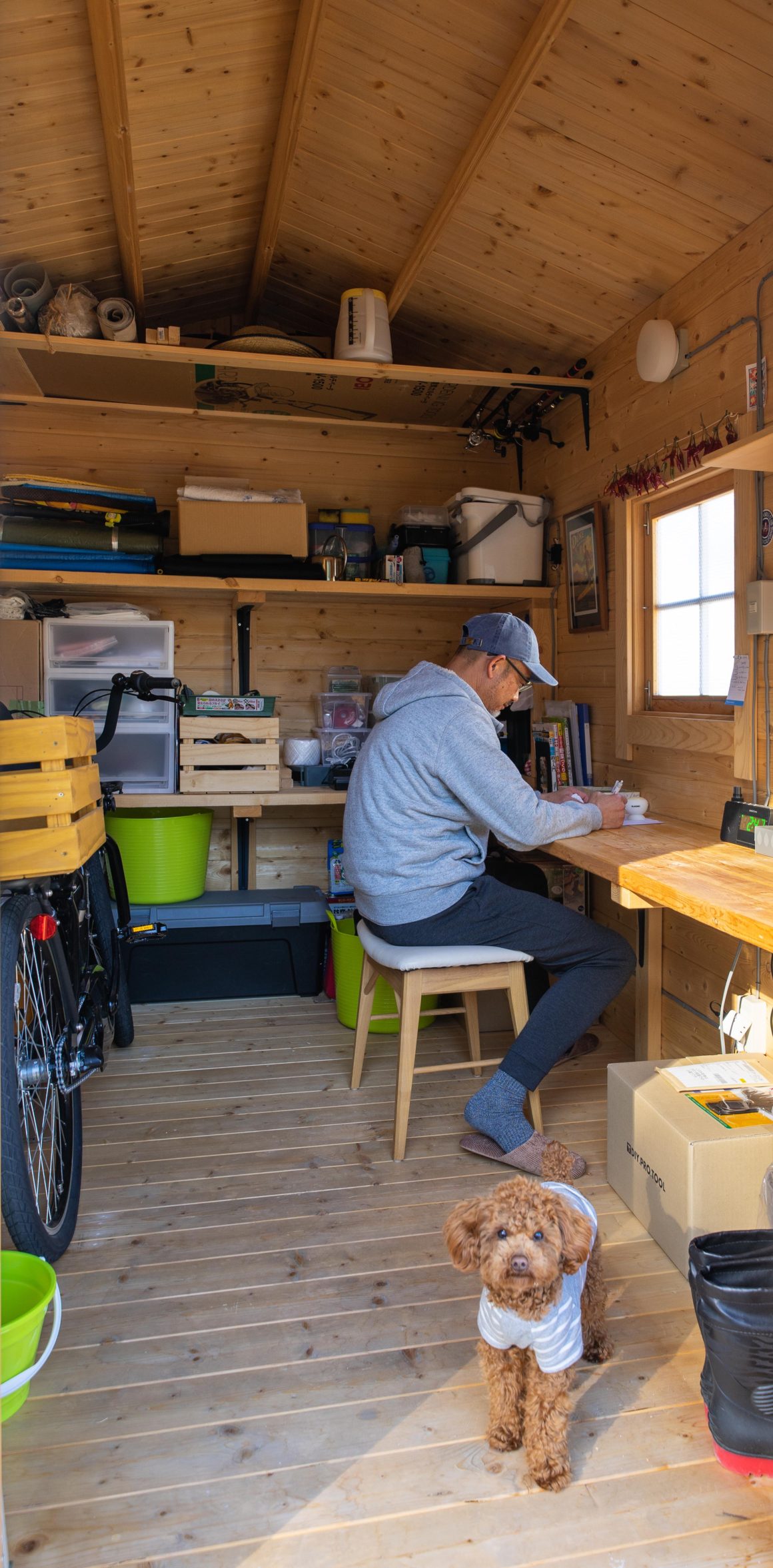 くだんの通り、住まいは長く過ごした南カリフォルニアの住宅を再現したもの。アメリカンなラップサイディングの外観と大きなカバードポーチ、外シャワー、室内には薪ストーブ。遊び道具は屋外の自作の小屋に収めてある。