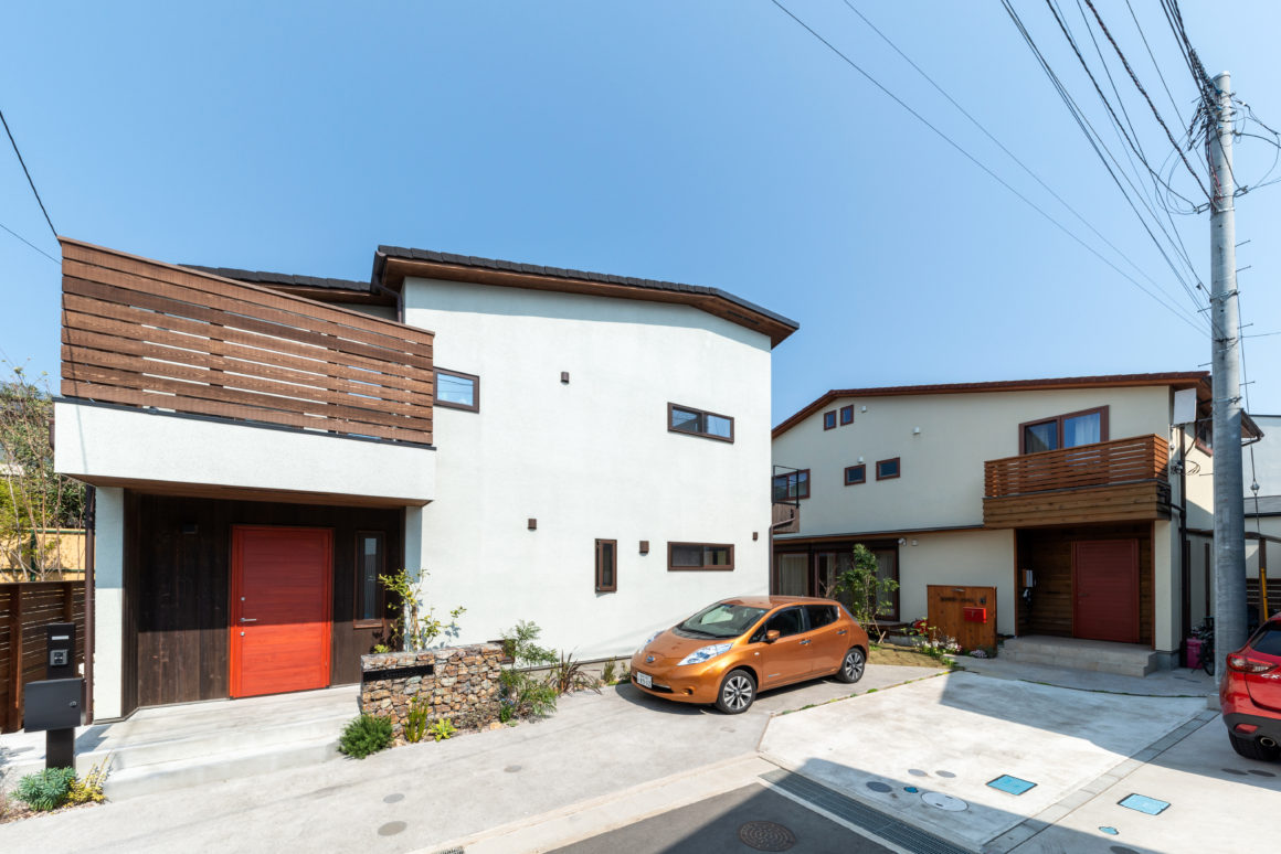 海辺の喧騒を離れて、逗子らしい静けさが取り戻る住宅街。その奥まった2軒の住宅は境界線のない広いウッドデッキでつながっています。