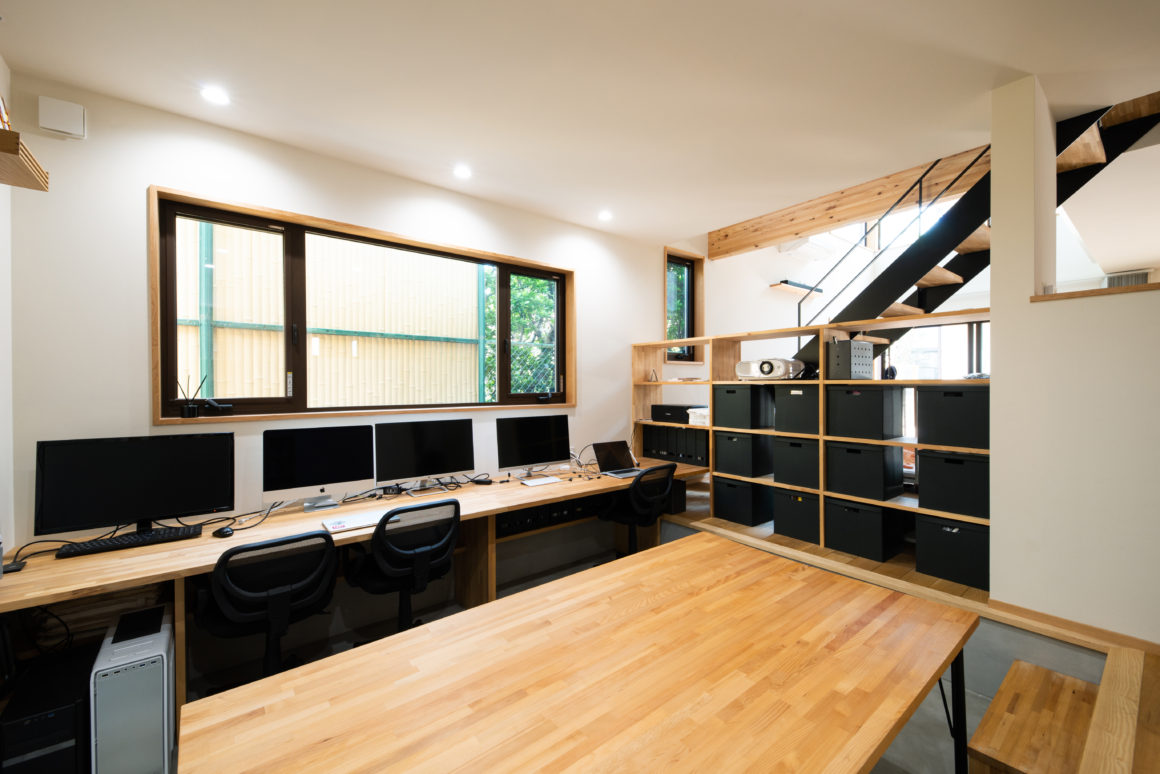 ご家族のプライベートな空間を2階に集約することで、1階に広いパブリックスペースを設けることができた。そもそもご夫妻のワークスペースを想定していた空間は、整然と整理されて、今ではシェアスペースとしても利用されている。床を一段下げることで、特別な空間であることを知らせてくれます。