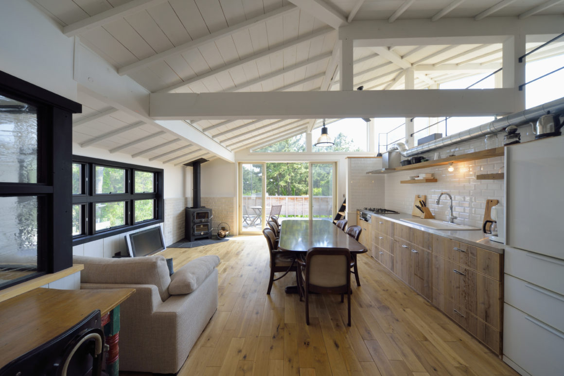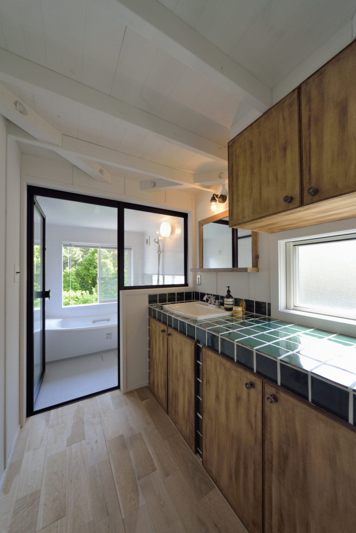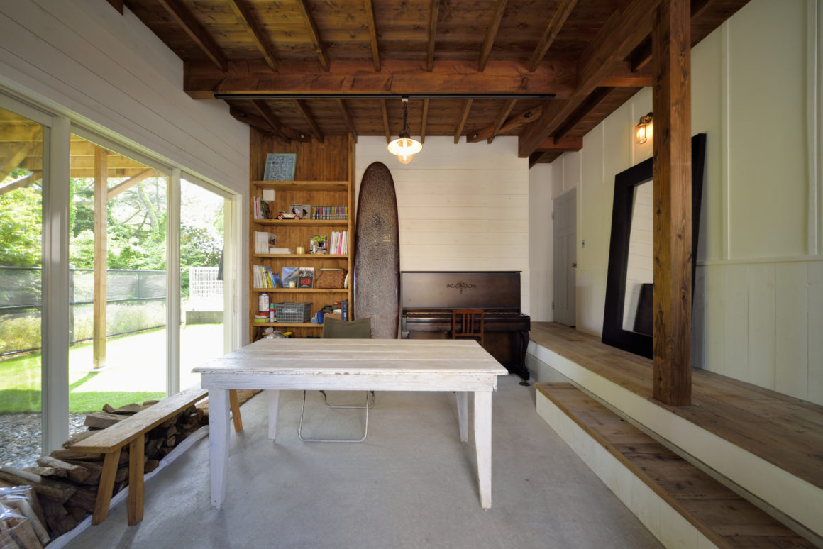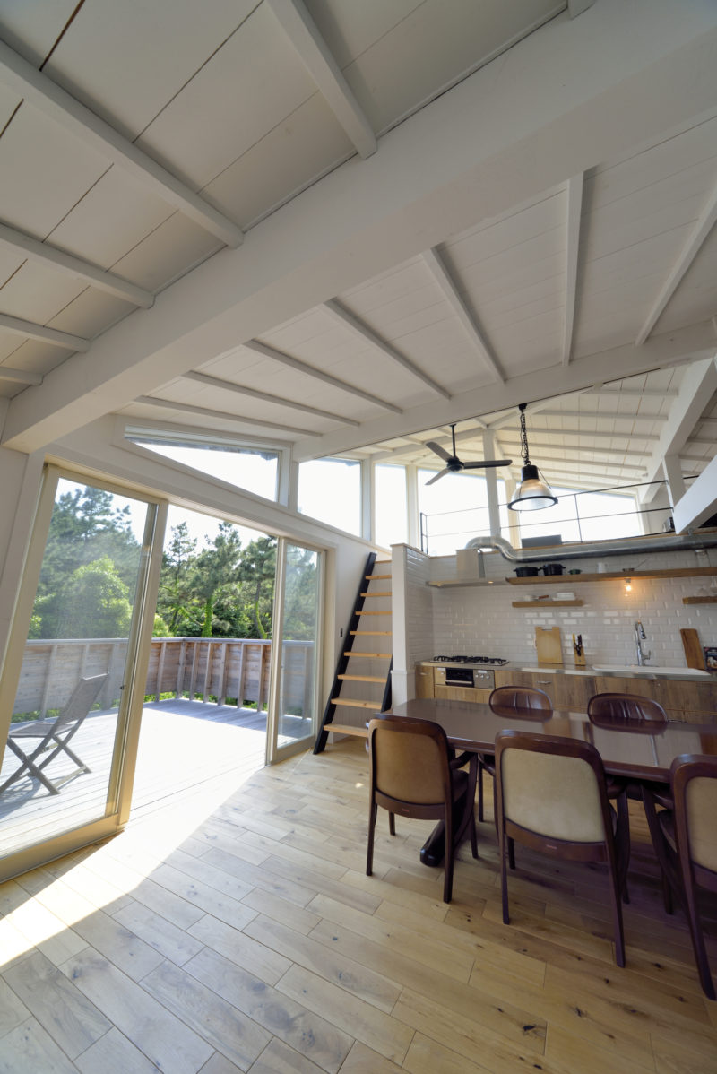 国道134号線から防砂林を隔てて建つこのお家は、潮風と遮るものがなく降り注ぐ太陽と防砂林の緑で満たされている。ここに主張しすぎる家は似合わない。自然の道理にしたがい天然の構造材や下地材、屋根は防砂林に溶け込むグリーン、外壁も防砂林の松のような無塗装の板貼り、室内は潮風と光をふんだんに感じられるようデザインしました。自然の恵みを受けながらなるべく自然体で暮らせるようなお家です。