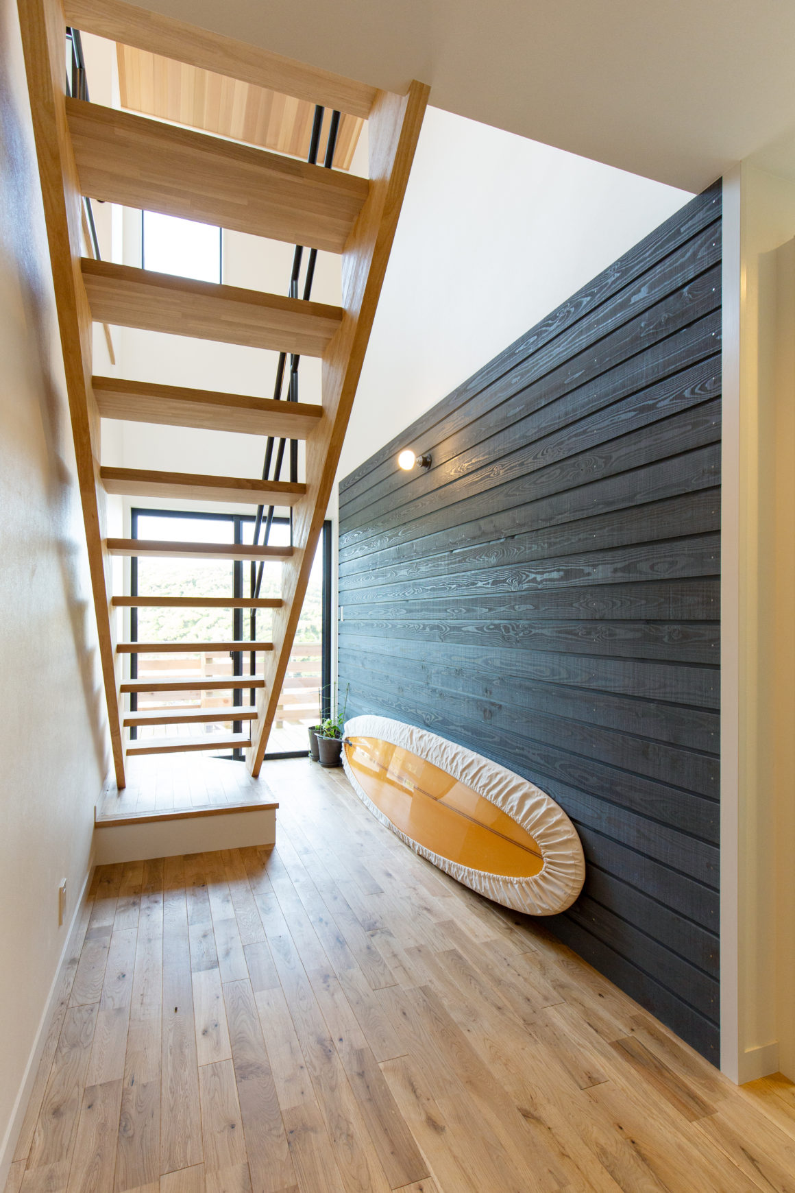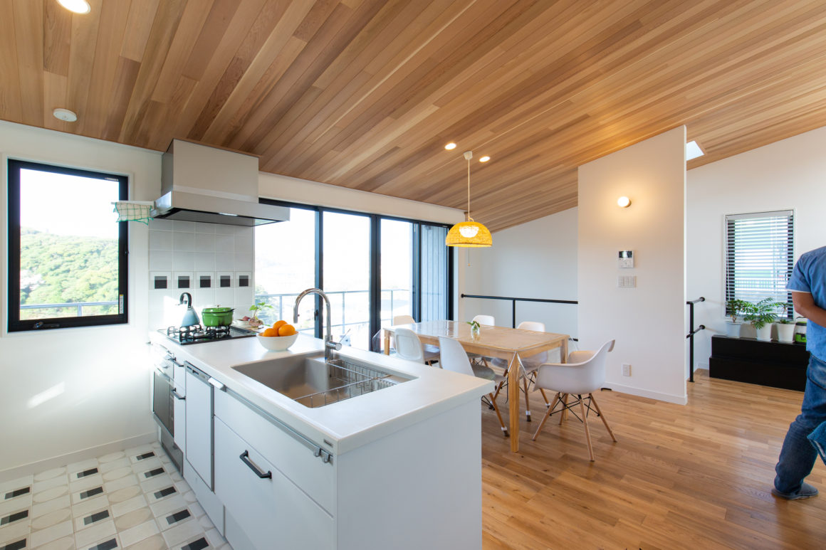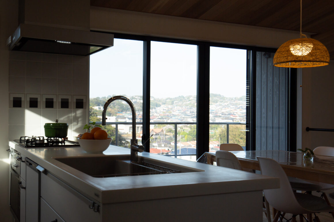 鎌倉でも有名な海岸沿いの抜け道 蛇坂に面するN邸。海からの香りも届くこの高台は北側の山を望める傾斜地に位置しています。北側の遠景を借景として取り込み、南からはたっぷりと日差しを取り入れる傾斜地を利用した断面計画としました。お客様の希望でもあるカリフォルニのような開放的な暮らしを形にしました。外部にはこれからの湘南の木張りのスタンダードとも言える信州カラマツ材を採用し、日本の森の活性を促す家づくりをここ湘南から発信しています。(海辺の工務店バウムスタンフ)
