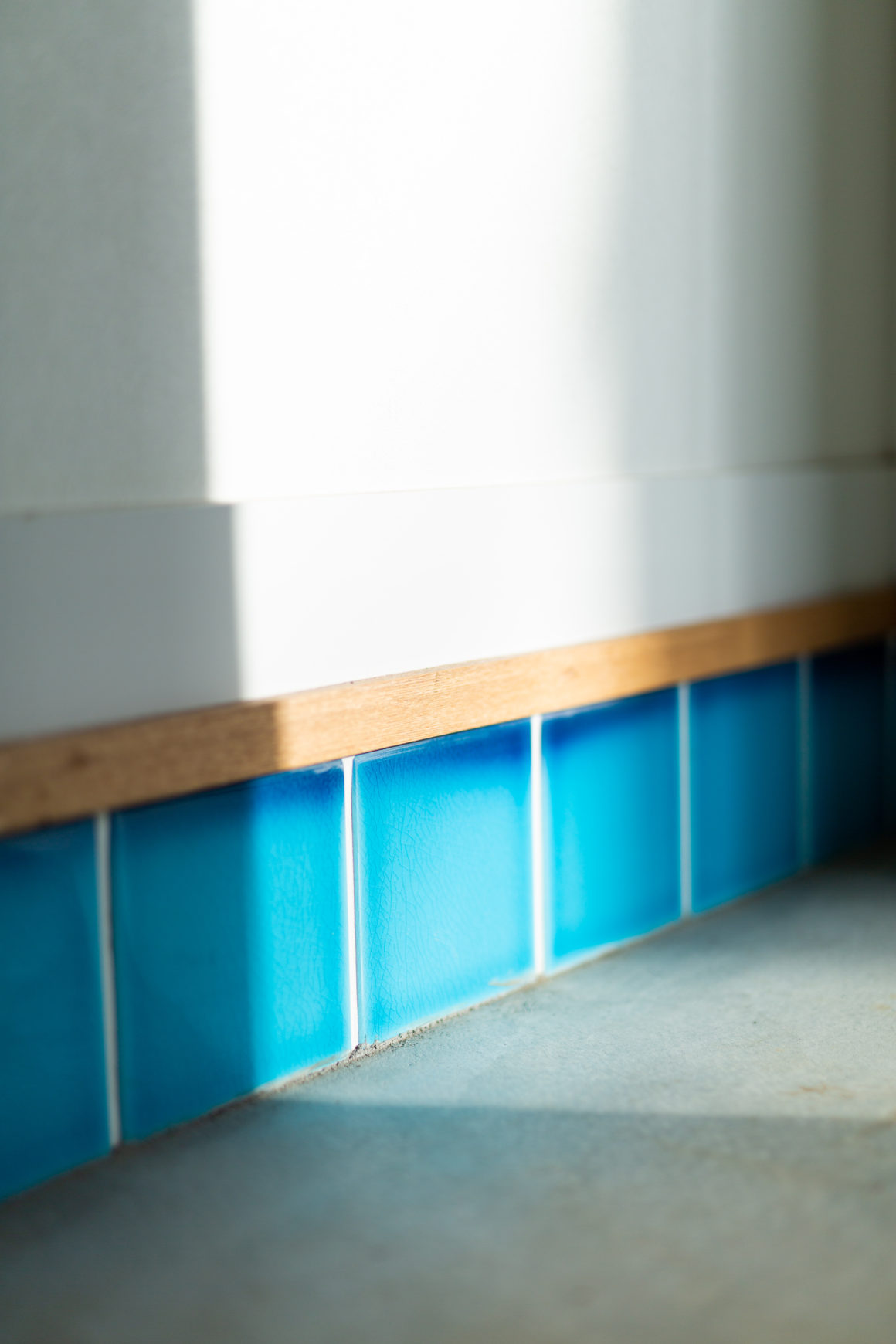 続いては玄関の足元。ブルーストーリーはまだ終わりません。ドアを開けて、飛び込んでくる外の景色と共に足元のブルーのタイル。スケートボードの世界ではよく使われる「プールコーピング」というワード。これもカリフォルニアのスケートカルチャーから拝借し、豪邸にあるプールの上の部分がタイルでできていて、渇水時期のプール禁止令が出た時に水を抜いて、そこでスケートを滑るようになったことから生まれたワードです。旦那も息子もスケートボードが大好きなので彼らが喜んでもらえたら嬉しいな、と思ってアイディアを出しました。玄関のブルーストーリーは海好きな私たちがおもてなしをするとき、お客様に海のイルカのように爽やかな気持ちになってもらえるように、という願いも込めました。シューズクローゼットにも張り巡らされていて、本当に大好きな部分です。