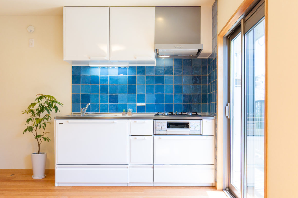 2人家族を想定してシンプルで使いやすいキッチンに仕上げました。壁面にタイルを採用したことで空間の素敵なアクセントになりました