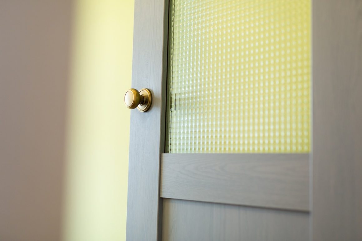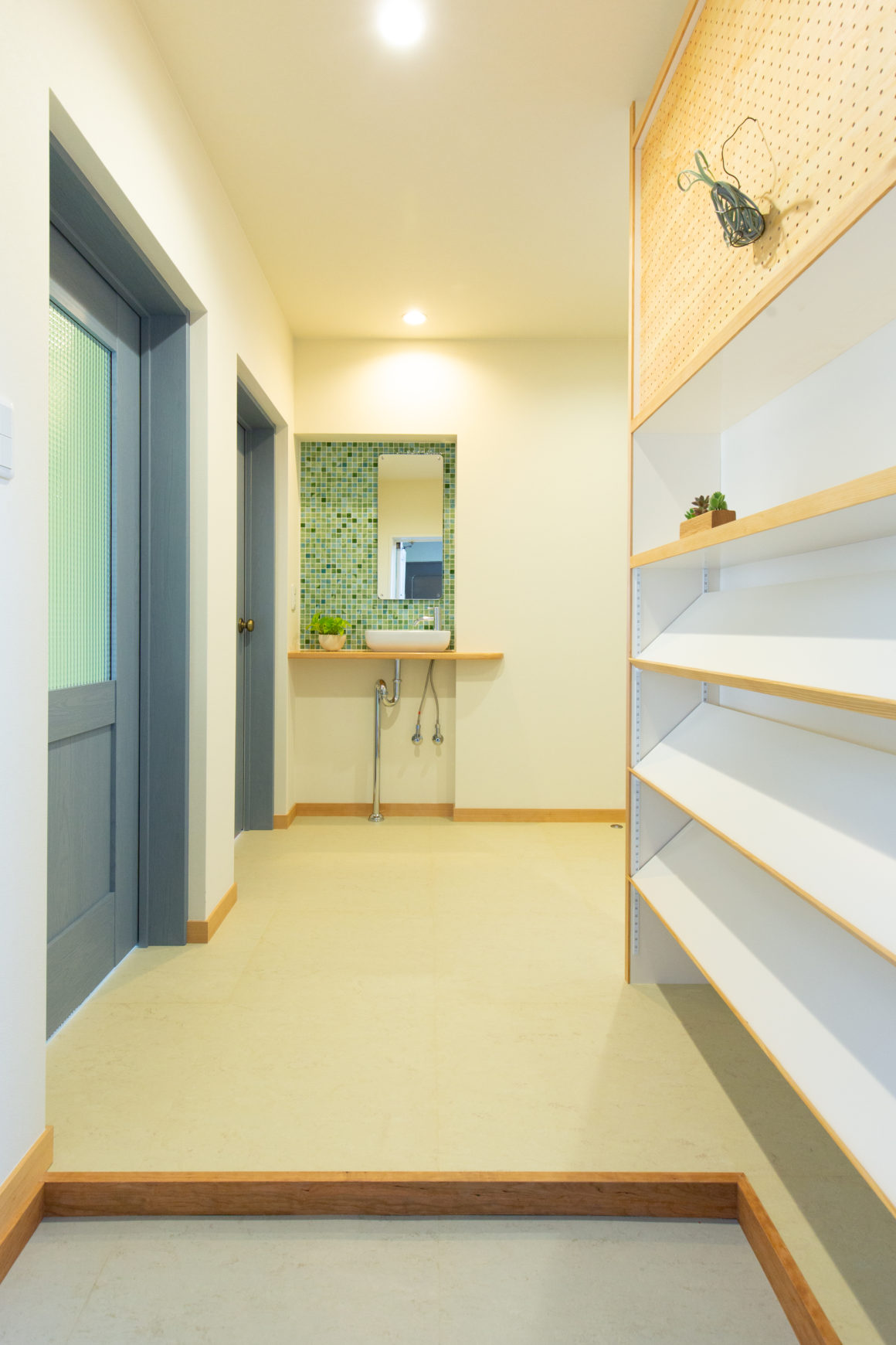 床を下地からつくり直したエントランスは、正面にタイルとスケルトン仕上げのおしゃれな手洗いコーナーを設置しました。奥行きの浅かった下駄箱は斜めに収納することで解消。居室の扉もおしゃれなブルーにしました