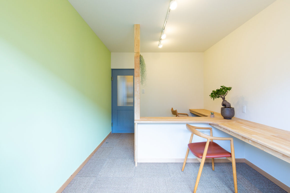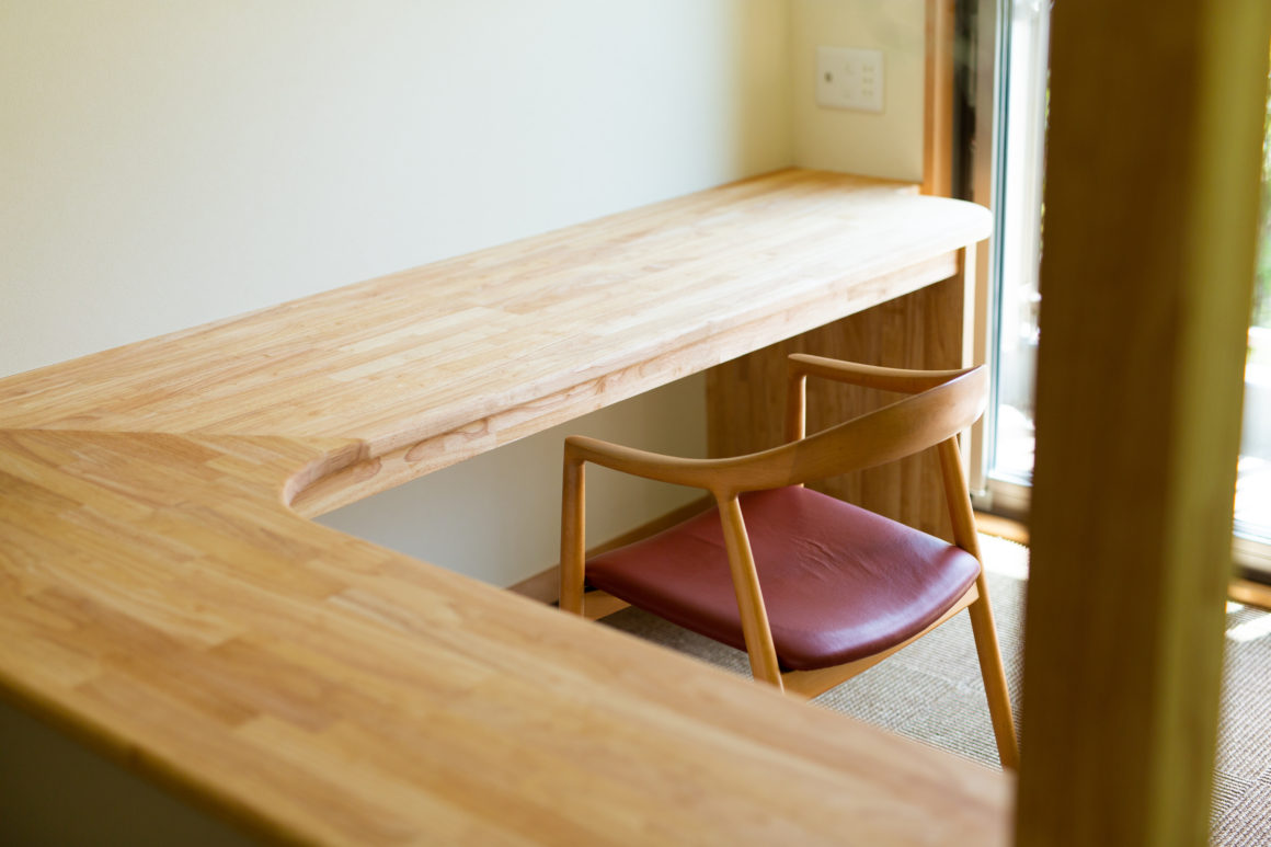 大きな⽊製の変形カウンターによってテレワークはもちろん、工房・書斎などフレキシブルな活用ができる空間です。他の部屋と仕上げ材を変えることで、気分も『仕事モード』に切り替えてくれます。趣味の空間として落ち着いて作業できる『私だけの工房』としても活躍してくれます