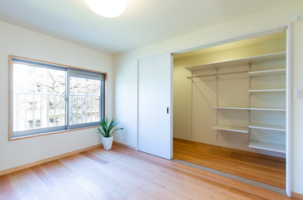 LDKからつながるブラックチェリーの床板。外周部にはしっかり詰まった断熱材によって快適な寝室空間を演出。ウォークインクローゼットには布団も入る奥行きのある棚板と用途に合わせて形を変えられるウォール収納をつくりました