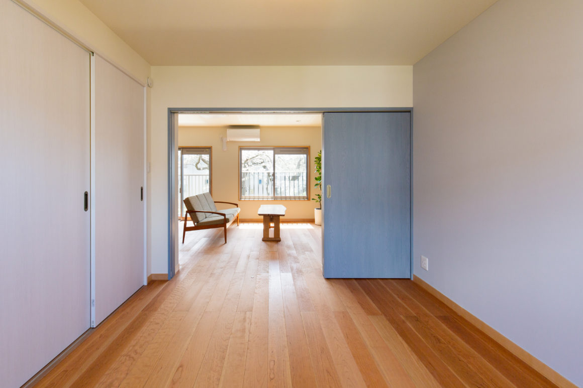 (P8−9ご参照)表情がきれいなブラックチェリーの無垢の床材を張り延ばし、ふた部屋に区切られていた空間をひとつにしてシンプルな空間になりました。これから住まう方の個性があふれる空間になってくれるといいですね