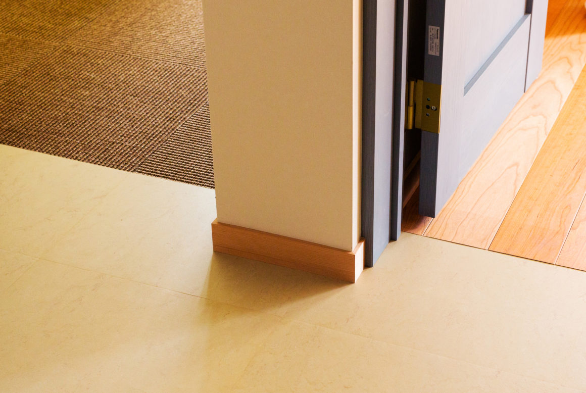 麻を材料とした「ココザイル」、アマニ油や石灰などの自然素材を混ぜた「リノリウム」、無垢のブラックチェリーと用途に合わせて3種類の床材で仕上げました