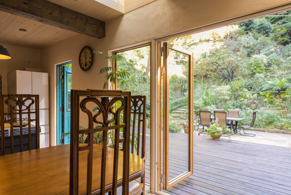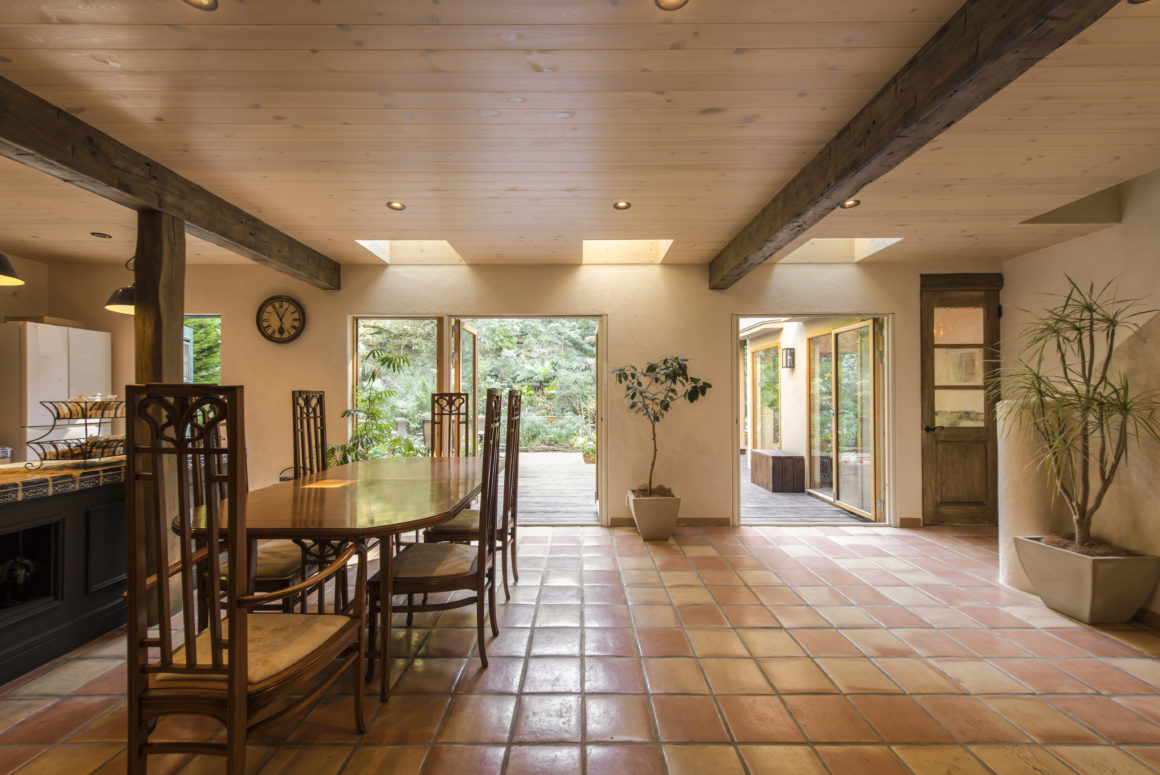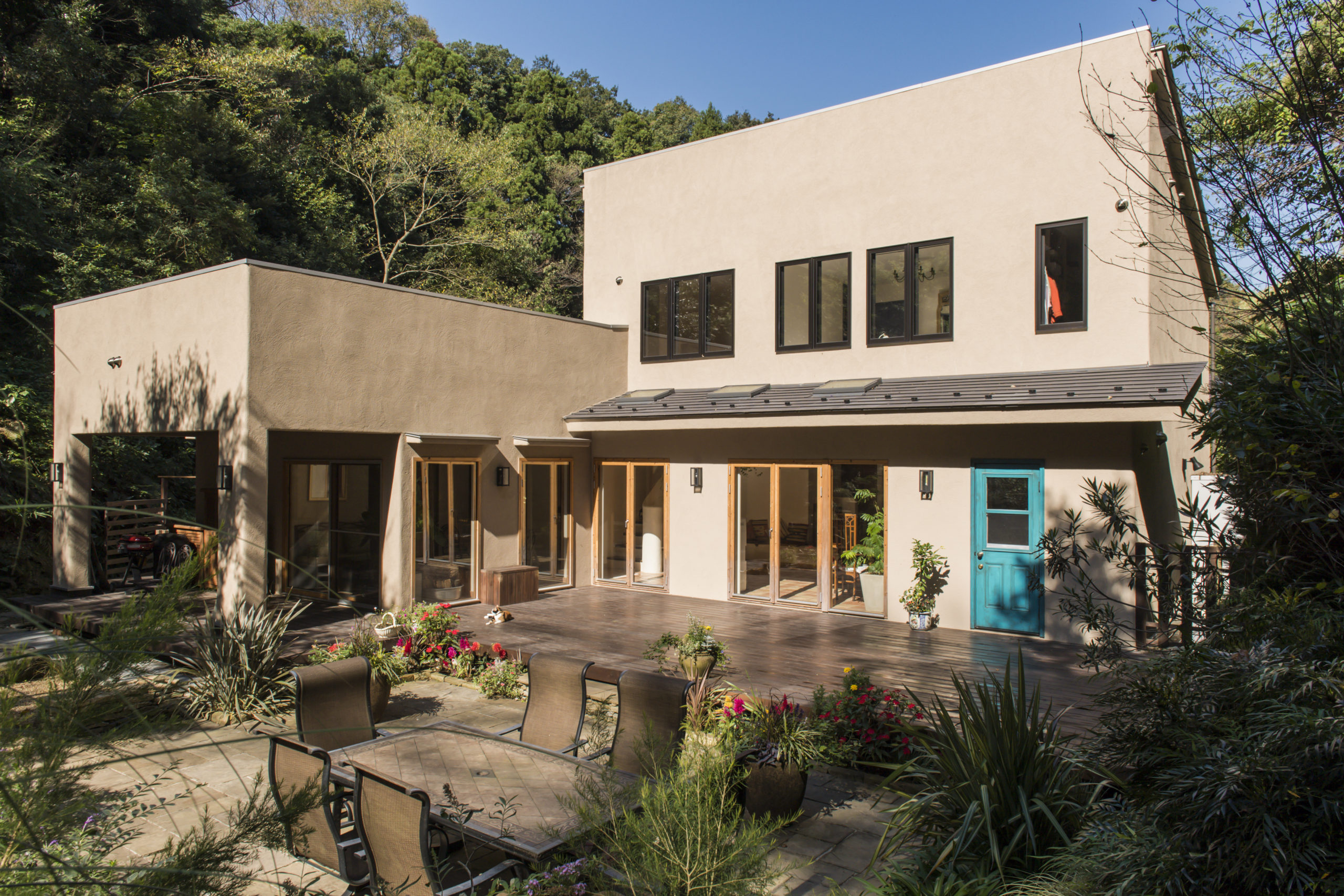 鎌倉の自然の中に佇む家。 デザインのテーマは「サンタフェリノベーション」、サンタフェといえばネイチャーデコールの王道スタイルのひとつ、やはりこのスタイルは時代が変わっても普遍的なものであり、包み込まれる包容力に心がシッポリはまっていくようです。骨組みだけを残し、基礎や構造の補強からはじめたフルリノベーションですが、以前の家の印象を忘れてしまうくらいの様変わりを実現しました。二頭の愛犬に二匹の猫ちゃんの居る、賑やかな家族ですが、ペットにとっても恵まれた自然と住環境で生活そのものが生まれ変わりました。ゲストを招いて外でBBQパーティーをよく行うというオーナーご家族のために、パーティーシーンを想定しながら人が大勢集える大きなデッキと内外を繋ぐ動線計画もこの家のポイントのひとつです。