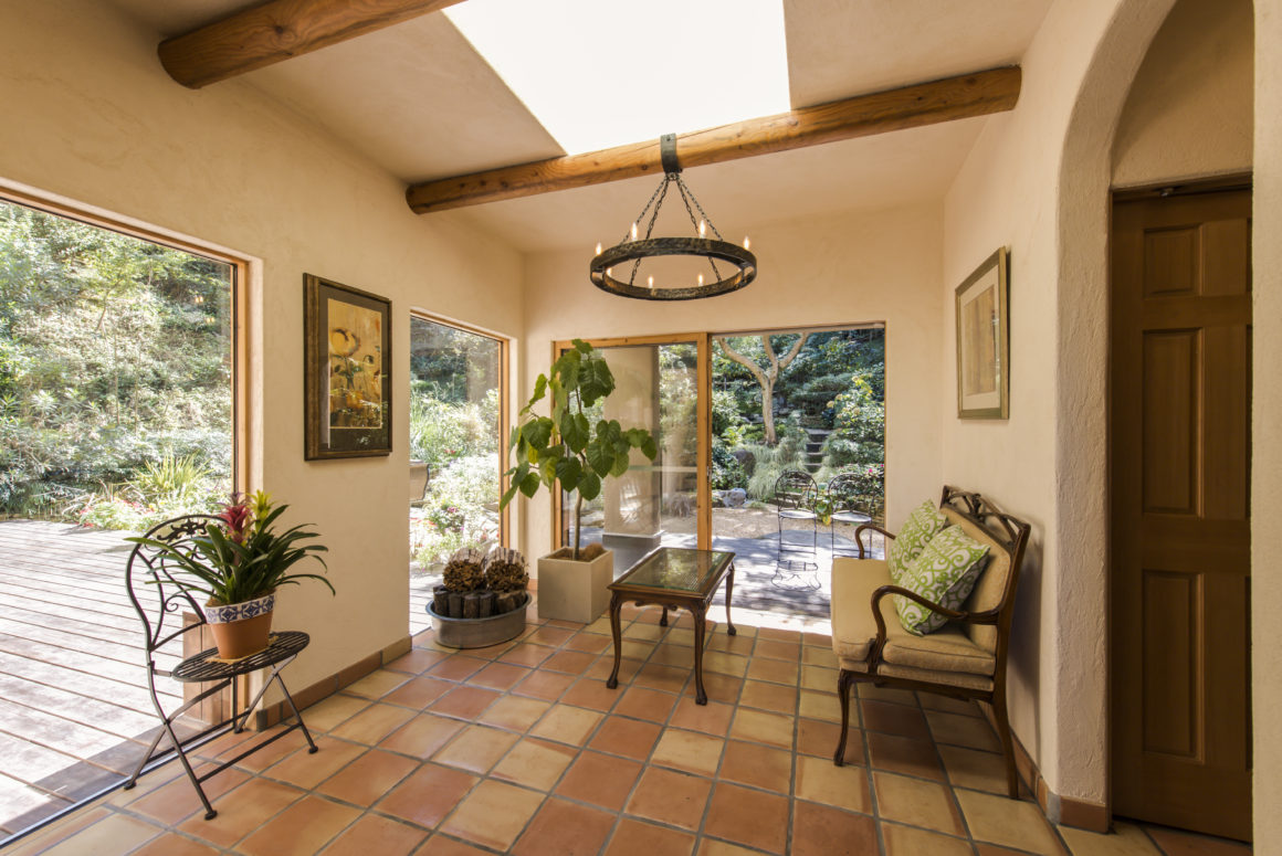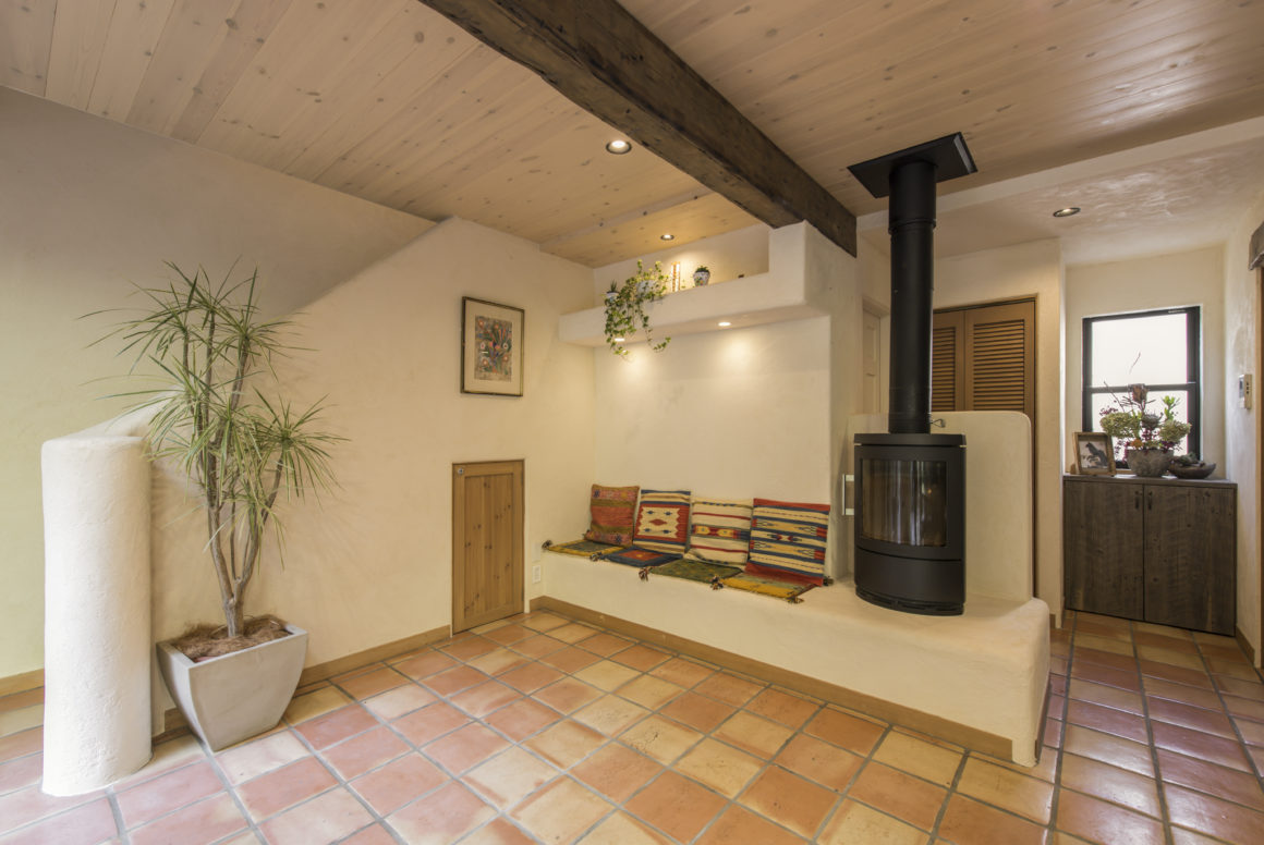 ご自身の敷地を山に囲まれ、カーテンも不要なくらいにプライベートが確保された、自然の中に佇む家。じつは構造も断熱も新たに補強し、間取りも変更してさらに増築するという大型リノベーション。デザインのテーマはネイチャーデコールの王道スタイル「The Santa fe(サンタフェ)」。素材感、質感のある表現は、この自然環境にぴったり。まるで違う国へ引っ越ししたよう。