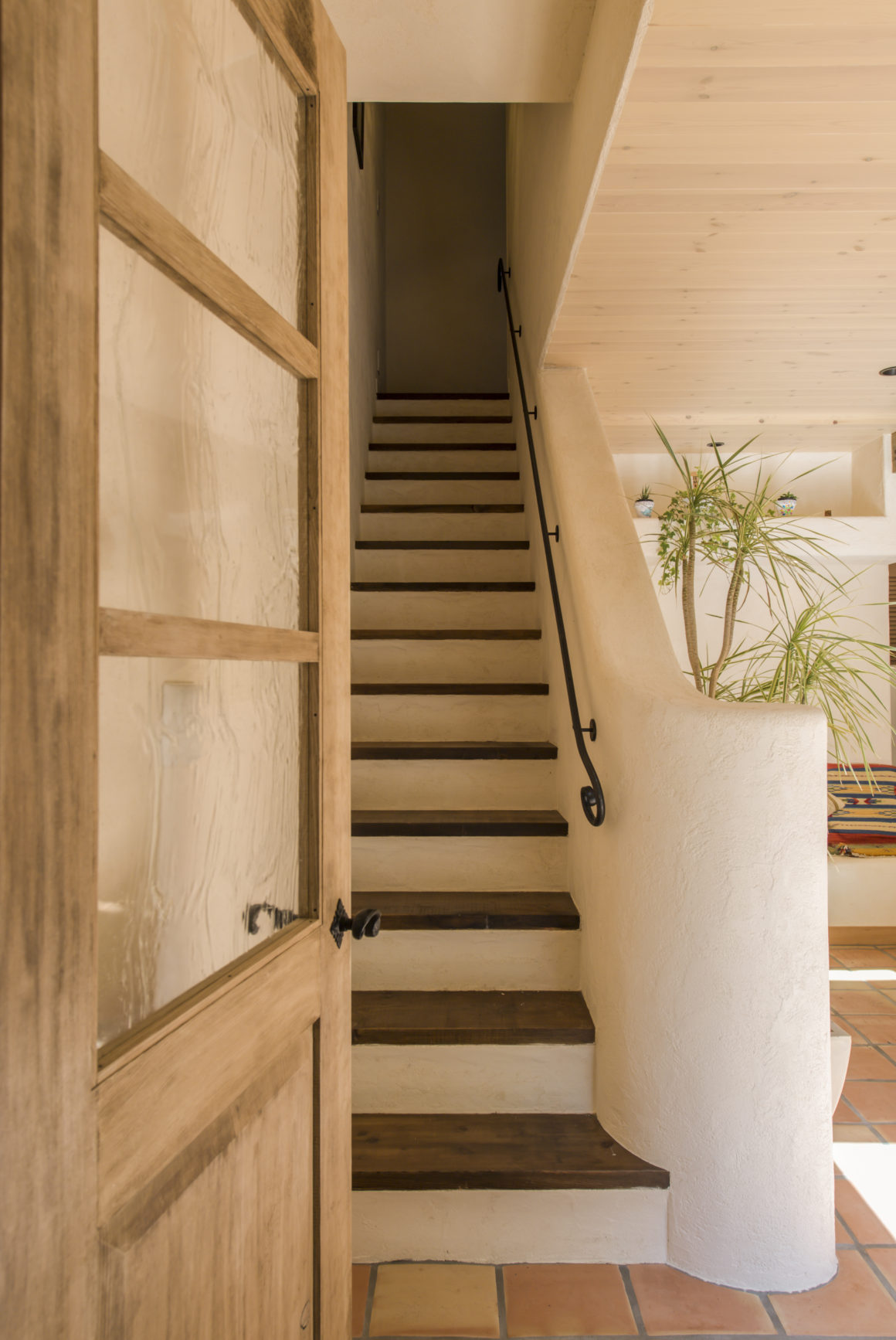 勾配のきついスロープを更に階段で10段ほど上り玄関へ。この階段も、以前よりは緩やかになるよう段数を増やし、アイアンの手すりで遊びのあるデザインを施した