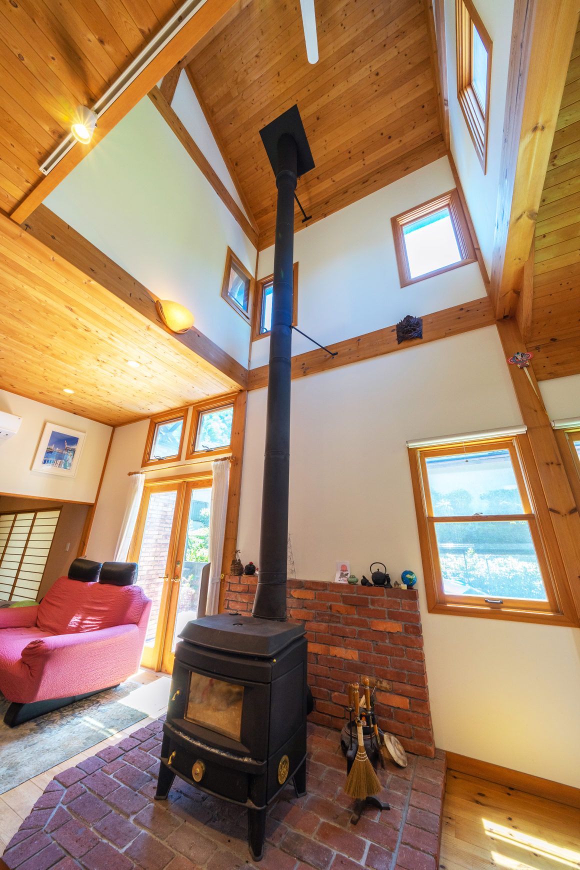 梶川氏 高さに変化をもたらす勾配天井や、吹抜を通して射し込む光など、天井の高さによる変化は生活する上でも有効な開放感です。特に吹抜けにおける薪ストーブの配置、煙突のバランスがとてもよく、家中がすぐに温まって、当時からよく考えられていたと思います。