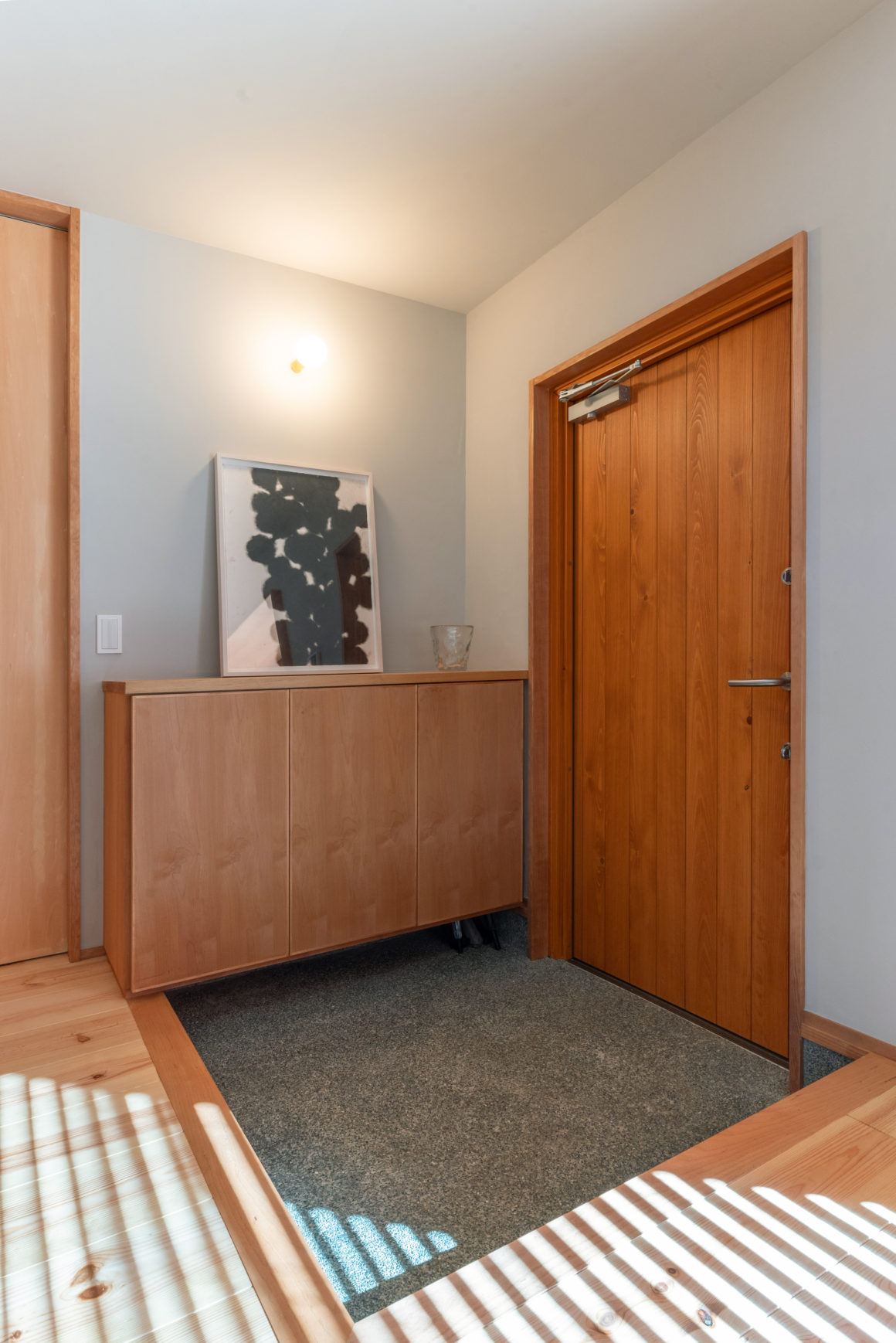 こうして完成したN邸は、丹念に手入れされた庭のアプローチの先には、朝日に照らされ木の外壁が光り周辺の環境にもよく調和しています。玄関の扉を開くとそこは仕切りのないリビングとダイニング。高い断熱性があるからこその大きな空間です。