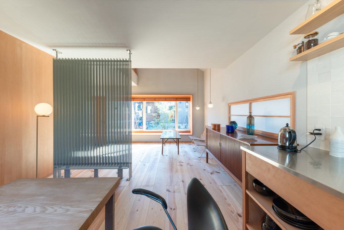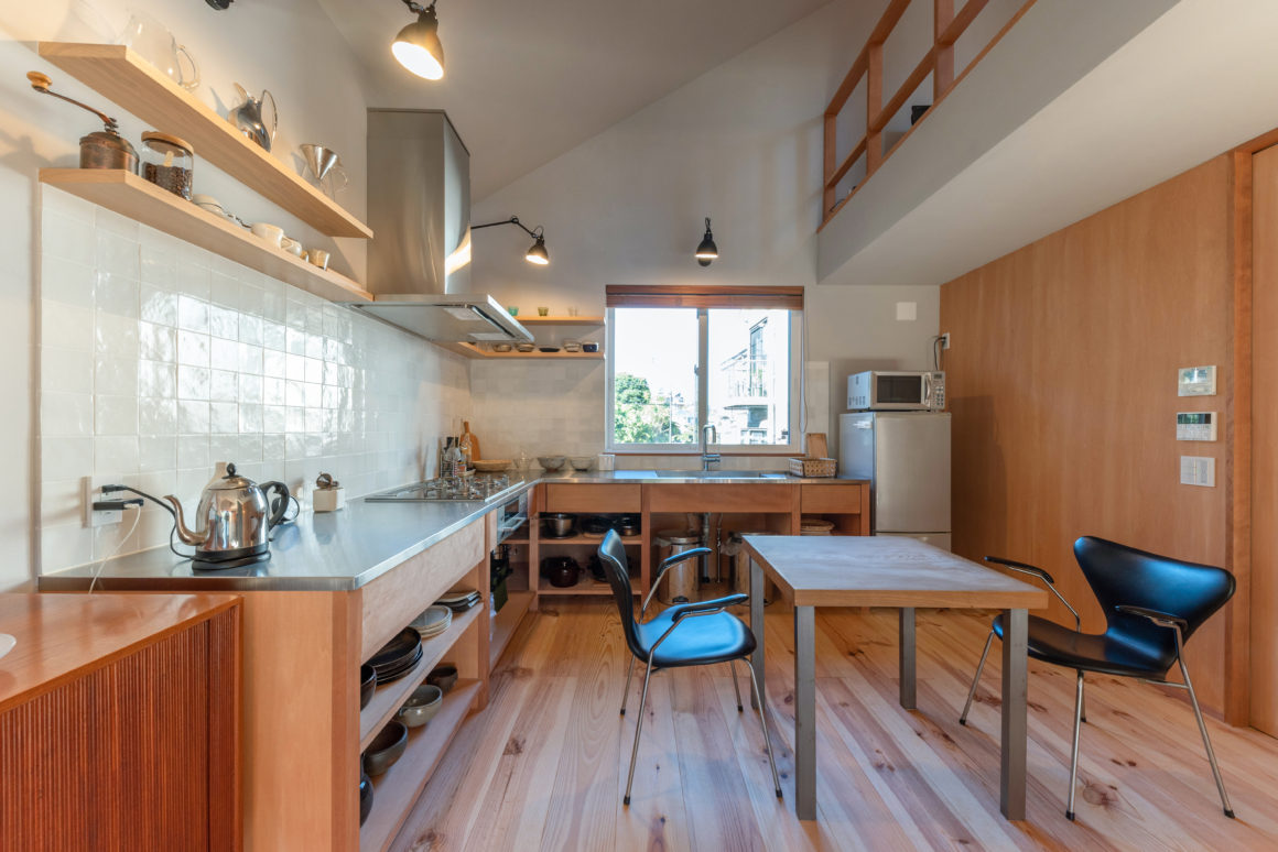 ペアの椅子を置いたリラックススペース、ダイニング、キッチン、さらに寝室とすすみ、バスルームを通って回遊できる最小限の動線。まるで、どこか山のオーベルジュで過ごしているように、静かだけれど飽きのこない楽しさを味わうような感覚。
