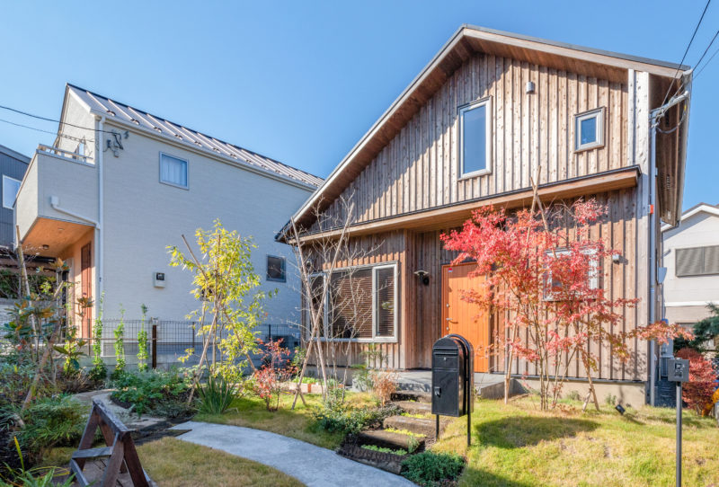N様のご要望は『山小屋のような小さな家がほしい』とのことでした。最初からイメージが明確でしたから、この住まいになるべくしてなったような気がします。ファーストプランからほぼ変更なく完成に至りました。高さを抑えた、板張りの外観、アプローチの庭の緑が、街並みに馴染んでいきます。内部は、外観とは一変してシンプルで落ち着いたインテリアとなっています。置かれる家具や、小物が引きたち、光の陰影がとても印象的な空間となりました。