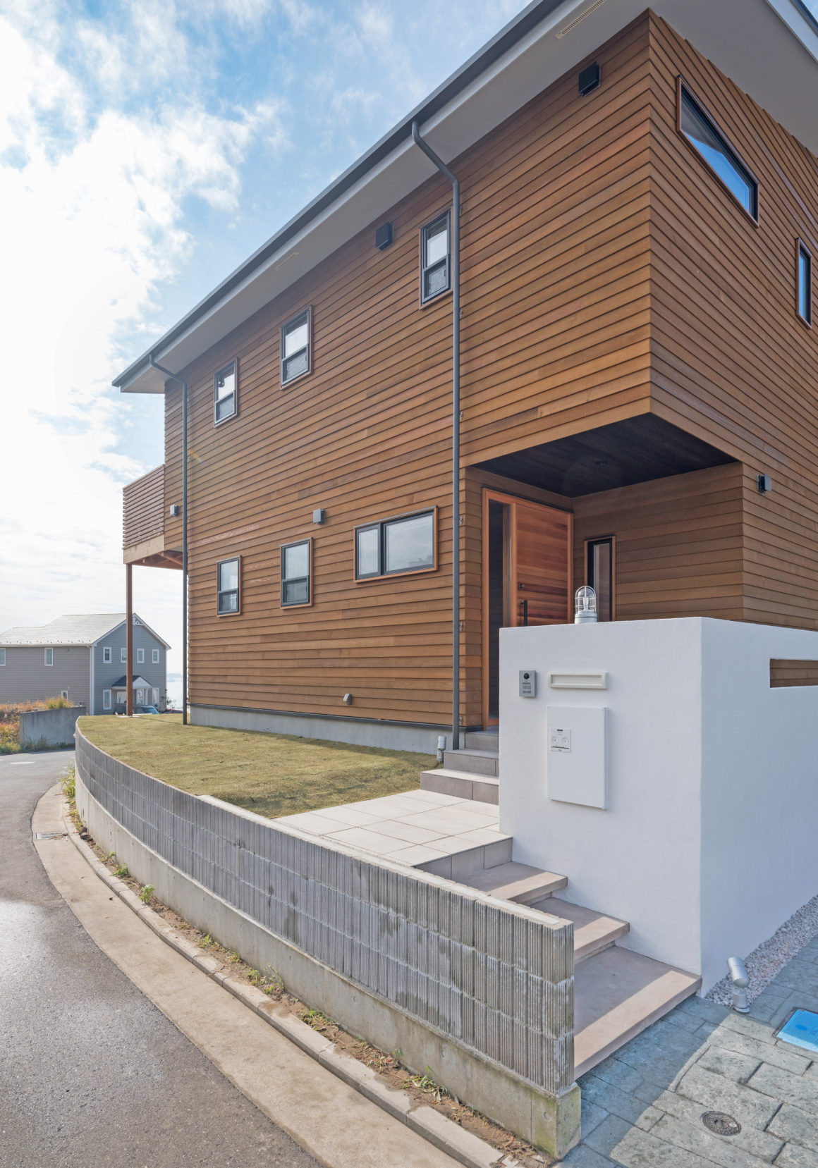 スモカラーを塗布。最後まで⾃然素材でまとめぬいた邸宅に。今では施主⾃ら選び植え込んだ海辺を感じさせる植栽の数々が⾵にそよぎゲストを迎えます