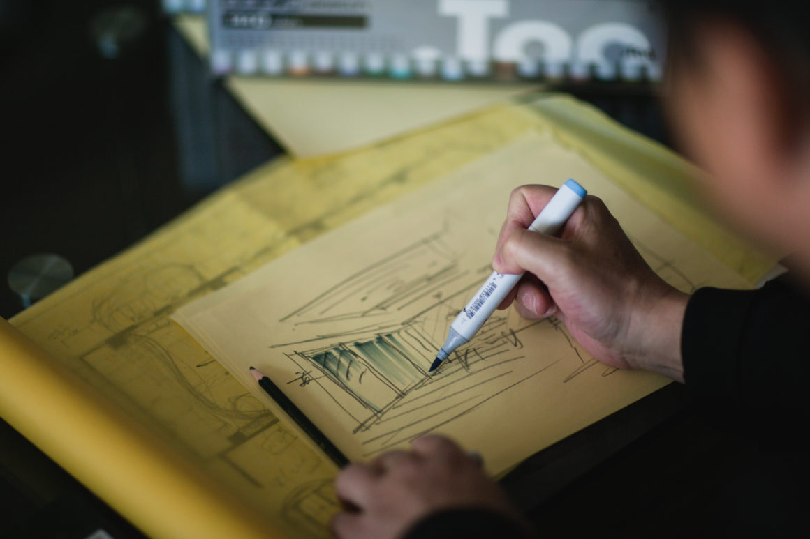 デザインの原図はすべて私が手がけています。イメージですから3Dスケッチをその場で描きます。頭の中で描いている空間をそのままトレースしている感じで線を引くだけです。