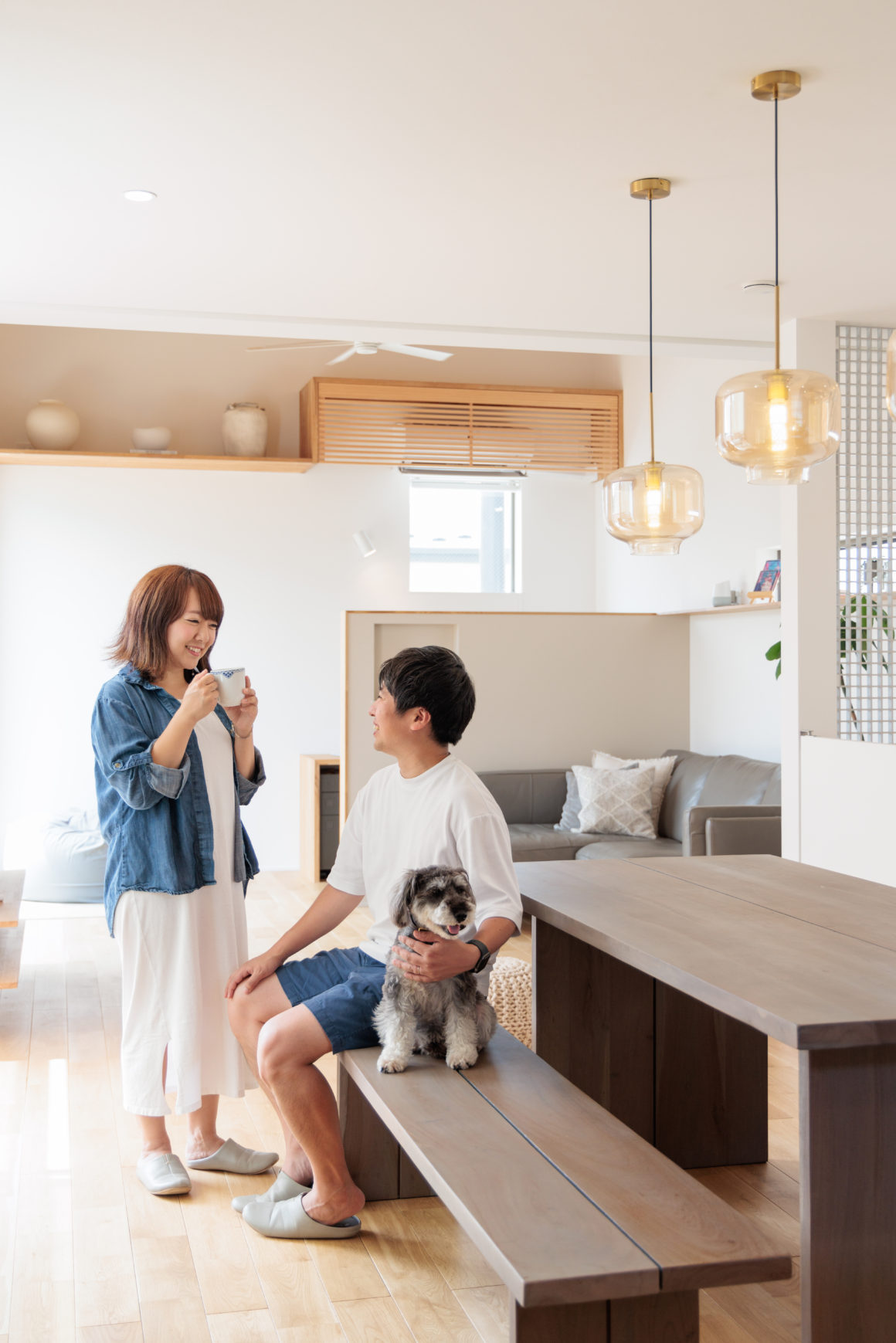2階はキッチン、ダイニング、リビングさらにはウッドデッキまで一体となって開放感ある設計に。1階と2階のテイストの違いは日常生活に快適なリズムが生まれそうです。大切なテレワークのためのワークスペースは、1階にご主人、2階リビングの一角に奥様分と二人分をしっかりと確保して仕事に専念できます。