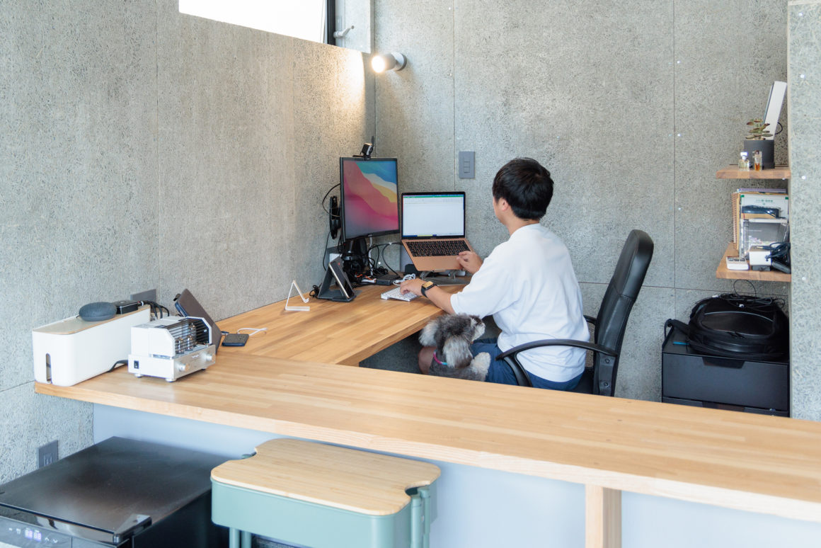 「朝、余裕があればクマの散歩に出て朝ごはんをとって家の中のそれぞれの場所でそれぞれ仕事を開始します。この家ができてから家が快適なので、お昼ご飯も家でとるようになりました」