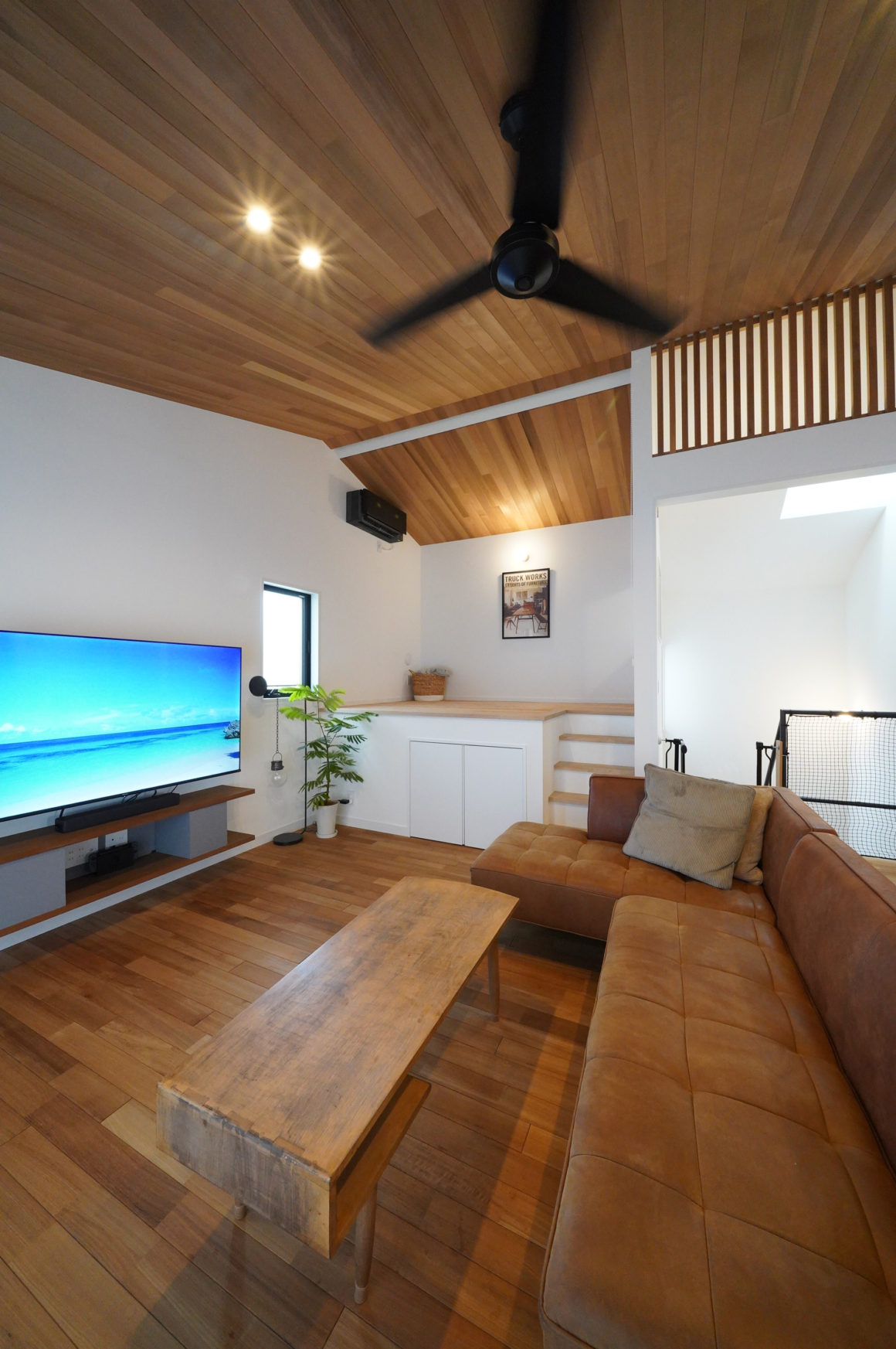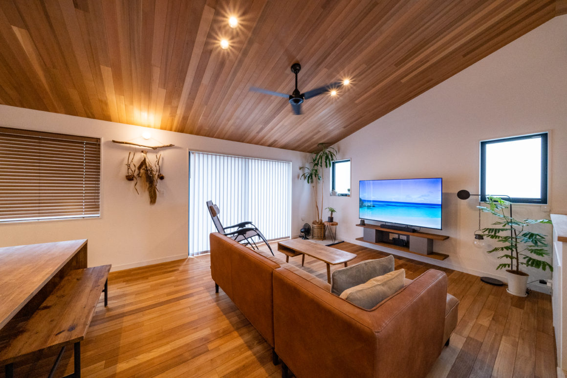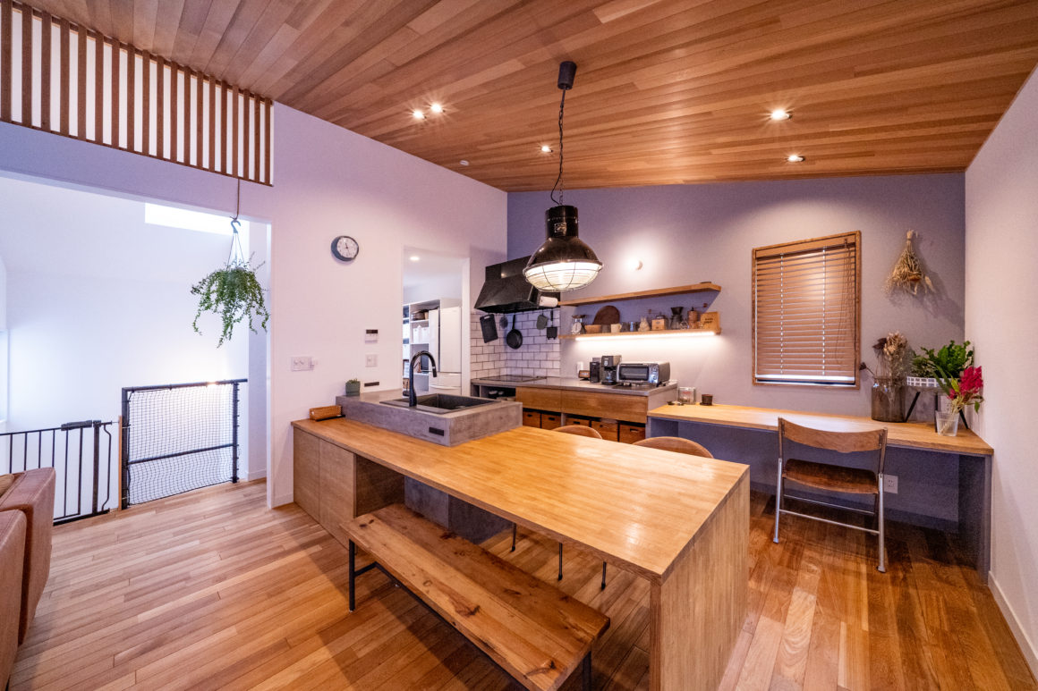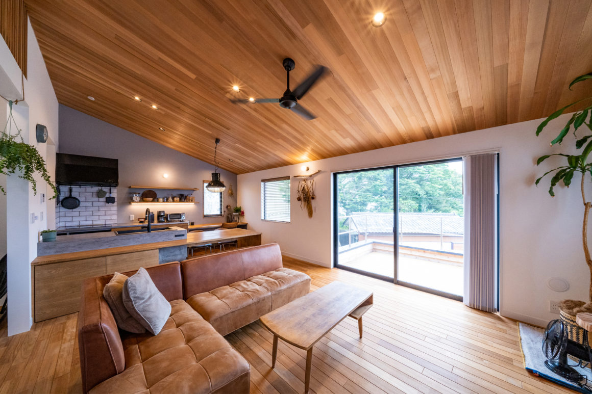 居室を1階において、2階は家族が一つのスペースで一緒に過ごせるように勾配天井の大きなリビング&ダイニングを配置しました。見晴らしの良い南側には大きなウッドデッキを備えました。