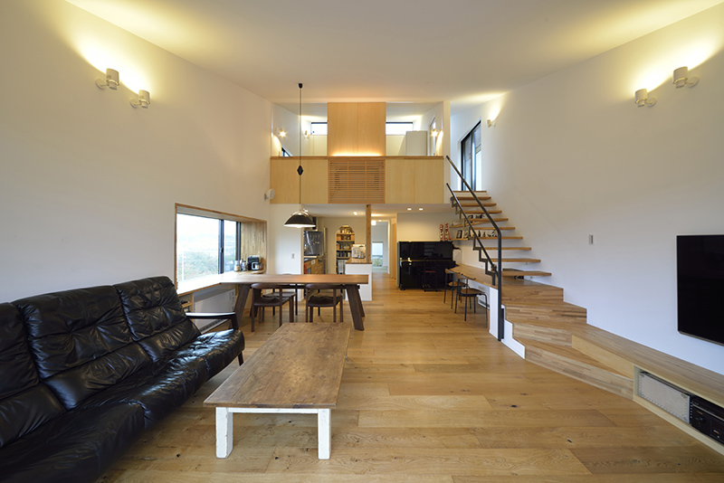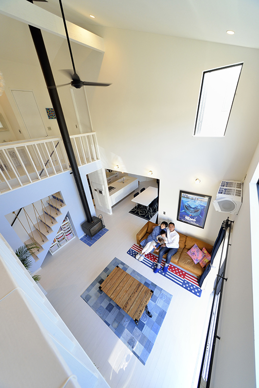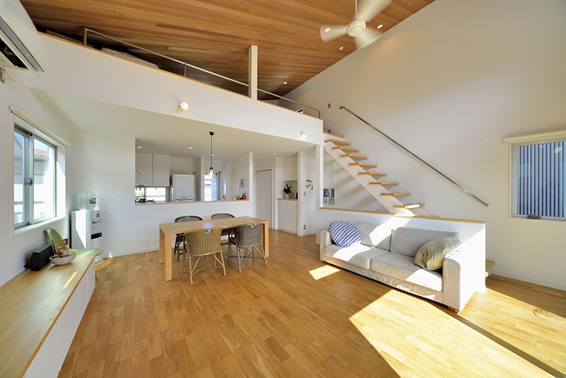 吹抜、リビング&ダイニング/米杉レッドシダー材