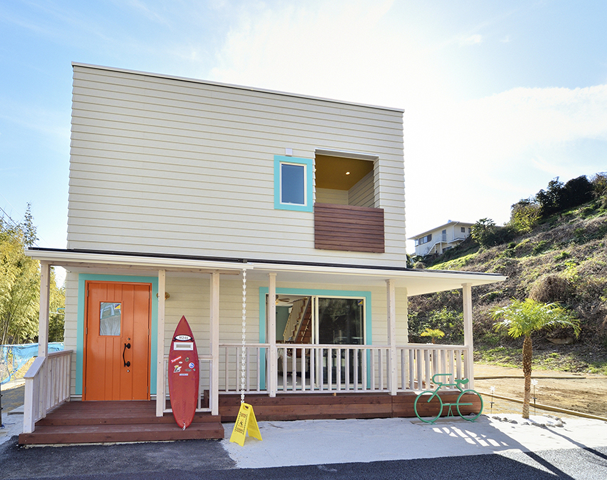 遠くに海が見える丘の上。谷戸の向こうは太平洋。そんな素晴らしい環境に完成したこの絆シリーズ『Aloha』。アメリカンスタイルのラップサイディングを採用してハワイアン住宅をリアルに再現した外観。深い軒を作るカバードポーチは見栄えだけでなく、ちょっとした雨も遮る機能性も嬉しい。