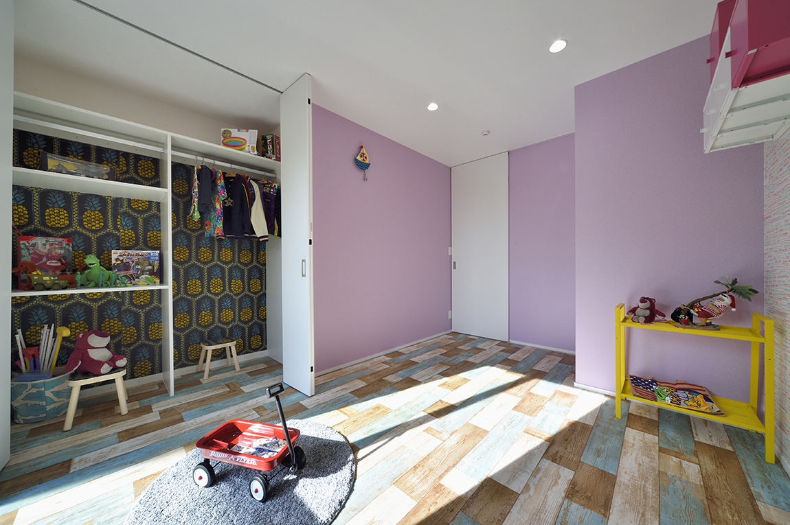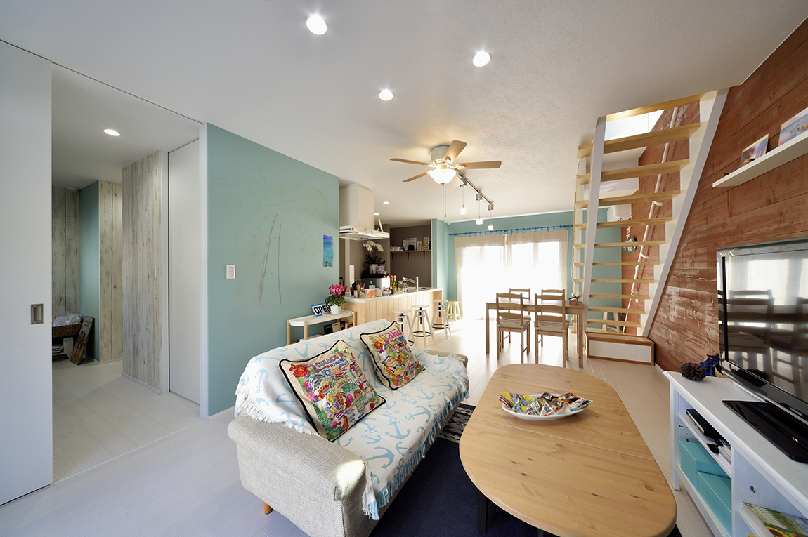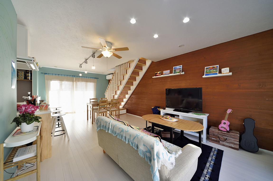 ママはご自慢のキッチンでケーキを焼いたり、パパはソファーでプラモデルに夢中。そのそばでお姉さんはフラダンスのレッスン。僕はお庭で愛犬とサッカーのトレーニング。それぞれのお部屋はリビング階段を利用して2階に集中しているから就寝以外はこうしてほとんどリビングで過ごします。